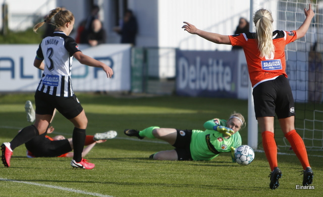 Þórdís Elva aftur með skot fyrir utan vítateig. Fast meðfram jörðinni, en í þetta skipti sá Ingibjörg við henni og varði vel.