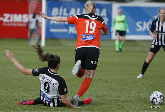 Kristín Erla missir boltann og Fylkis leikmaður nær honum. Ana Victoria kemur hins vegar til bjargar og sýnir frábæran varnarleik og rennir sér í boltann og nær honum!