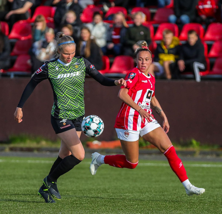 Nú fær Bergdís Fanney spjald. Brýtur úti við hliðarlínu.