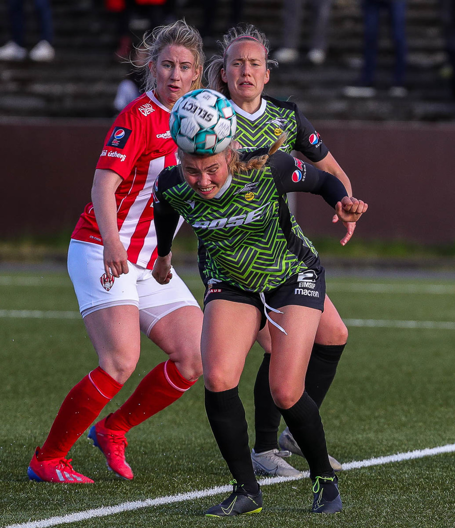 Bergdís Fanney er of sein í tæklingu á Sóley en sleppur við spjald. Svo virðist sem Helgi ætli bara að spjalda fyrir tuð í kvöld.