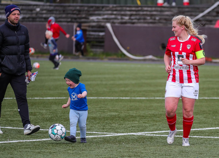 Nú fer fjörið alveg að hefjast. Liðin hafa lokið upphitun. Geggjað fótboltaveður í hjarta Reykjavíkur.