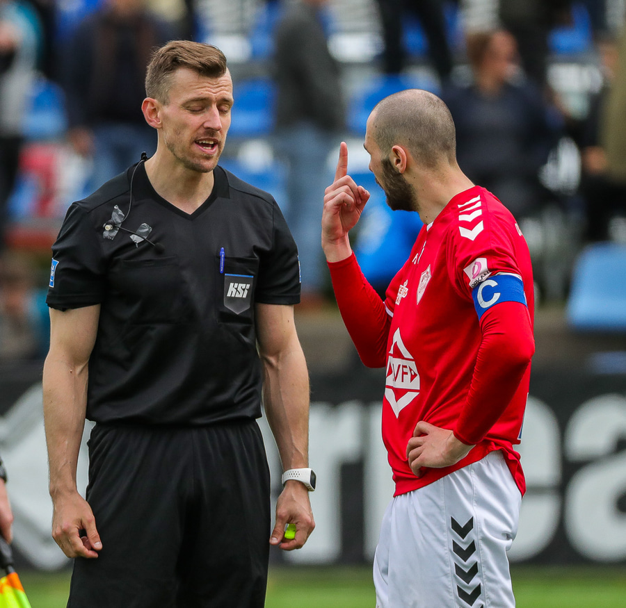Hér er mikil reikistefna. Chechu er rekinn útaf. Hann virðist hafa sagt eitthvað við línuvörðinn og rekinn útaf.