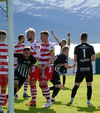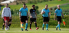 Leikmenn ganga hér inn á völlinn á eftir Sigurði dómara. Aðstæður hér eru mjög flottar. Sól og völlurinn lítur nokkuð vel út.