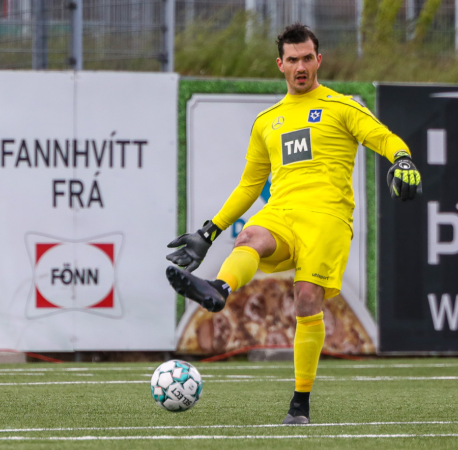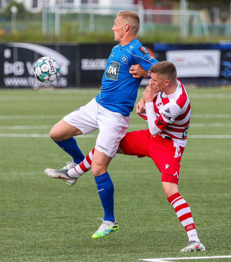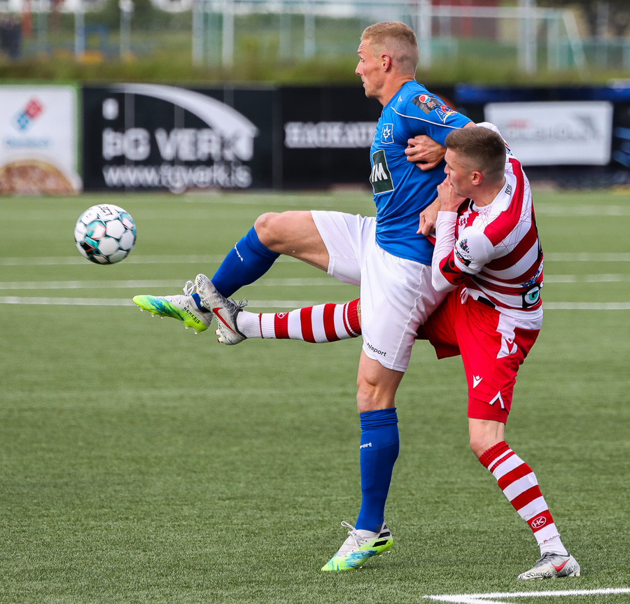 Biddi spyrnir boltanum fyrir og Jósef skallar frá.