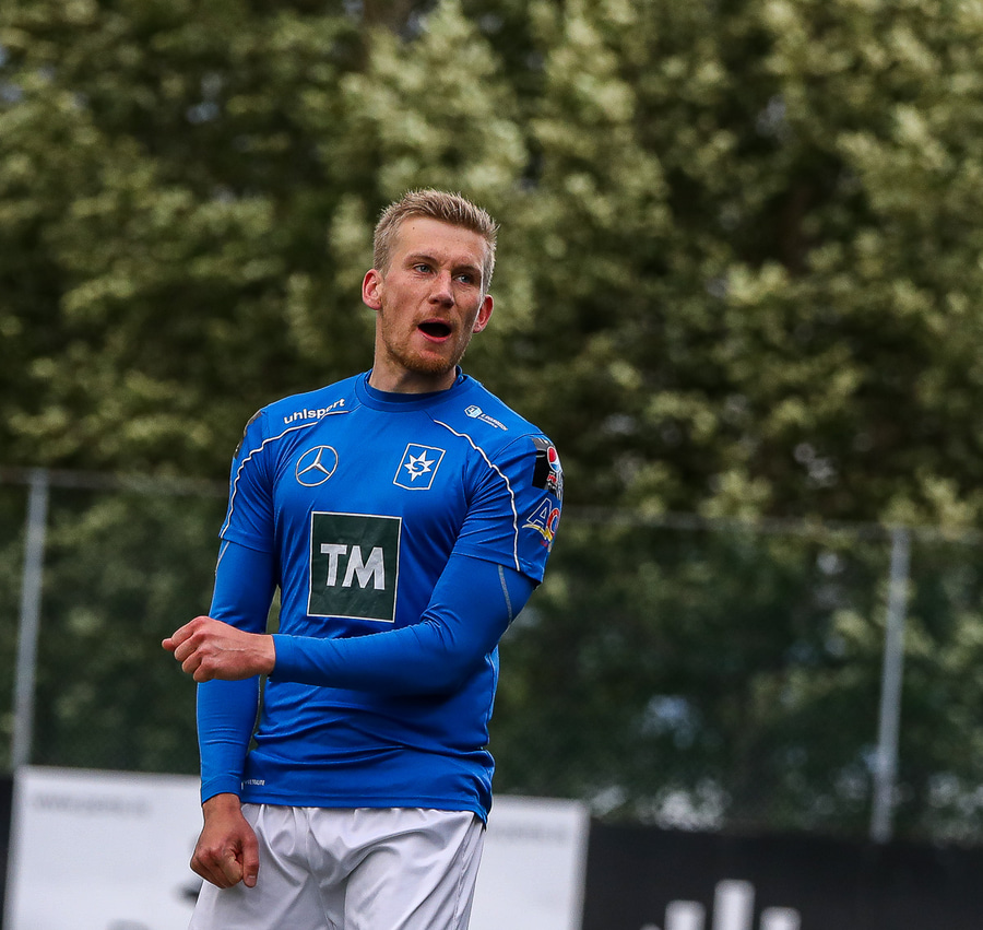 Gummi Júl með lauflétt mistök og missir boltann í gegnum sig til Gauja Bald sem snýr sér og lætur vaða en Gummi hreinsar upp eigin skitu og hendir sér fyrir boltann!