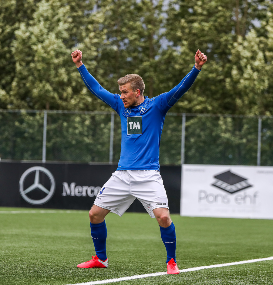 Þorsteinn rennir boltanum á Hilmar sem reynir skotið í fyrsta en langt framhjá og yfir.