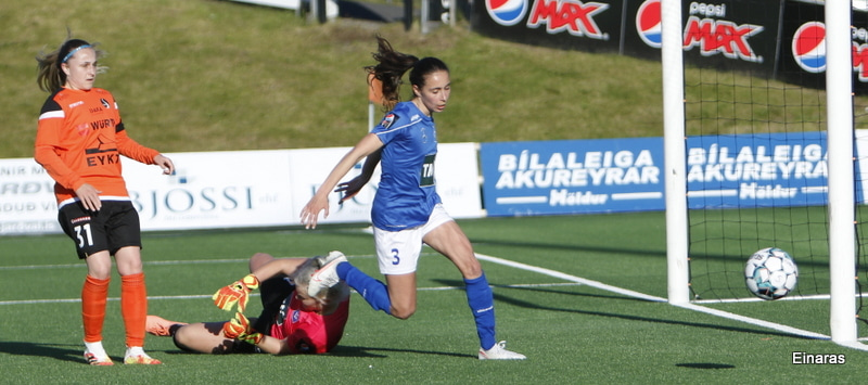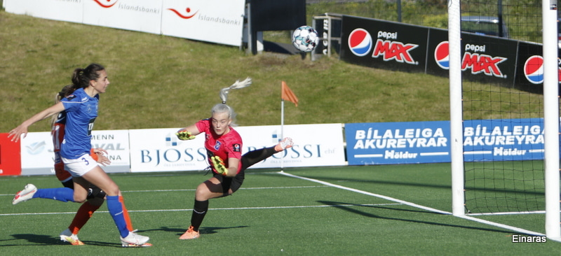 Spyrnan er góð og fer boltinn beint á kollinn á Jasmín Erlu og var ég viss um að boltinn væri á leiðinni inn þarna. En Þórdís gerir frábærlega og ver á línu