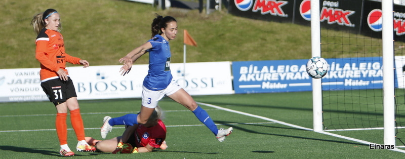 Bryndís er líklega að tryggja 3 stig fyrir sitt lið hér og það með hrikalegu marki. Bryndís tekur skot sem virkar laust og hættulaust en Birtu tekst einhvern veginn að missa boltann undir sig og inn í mark.