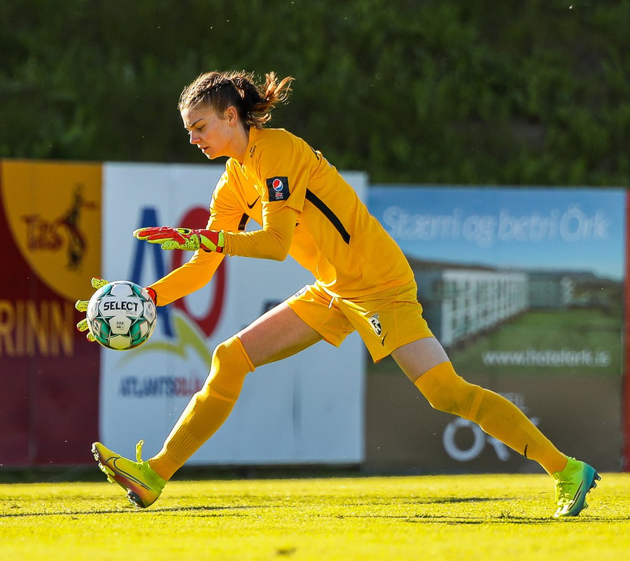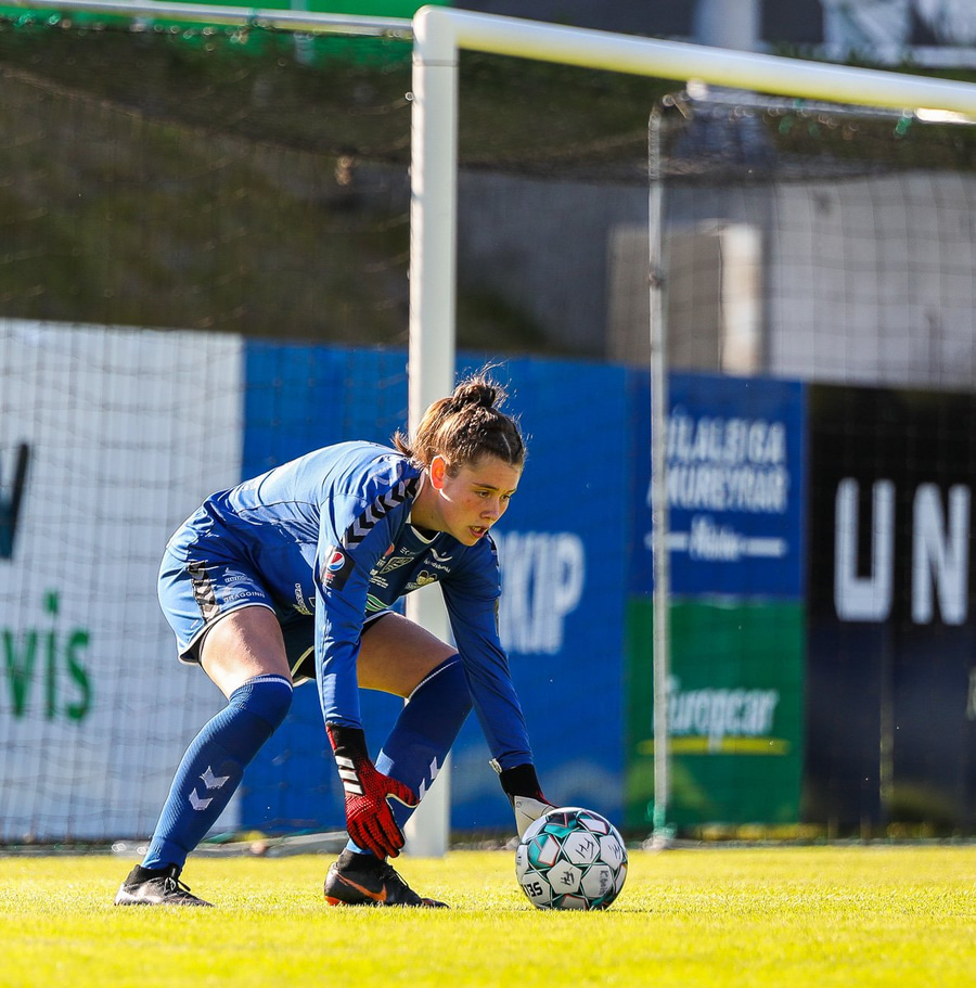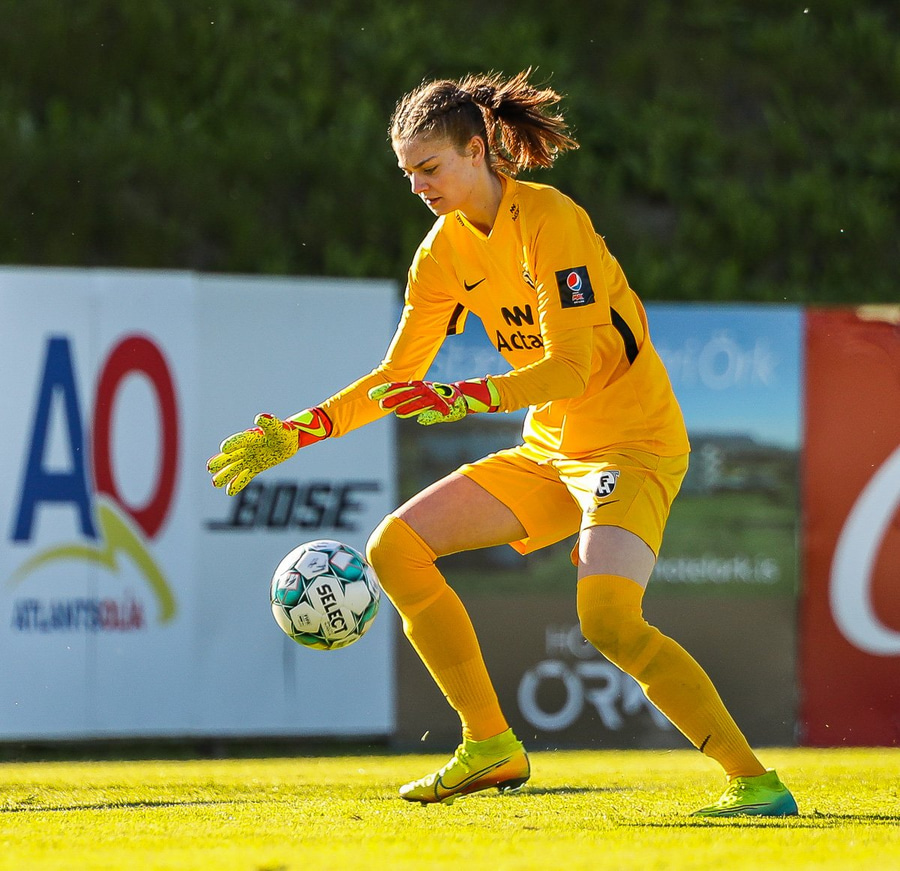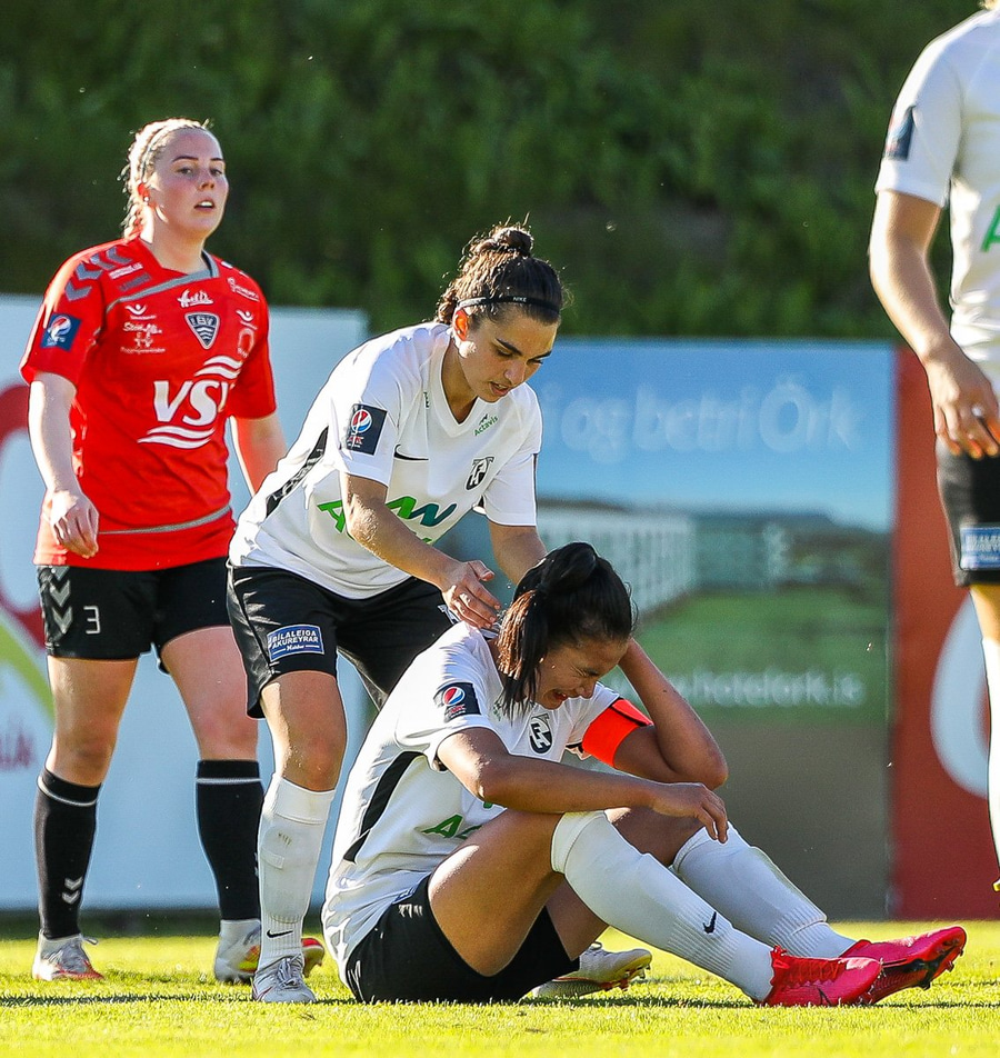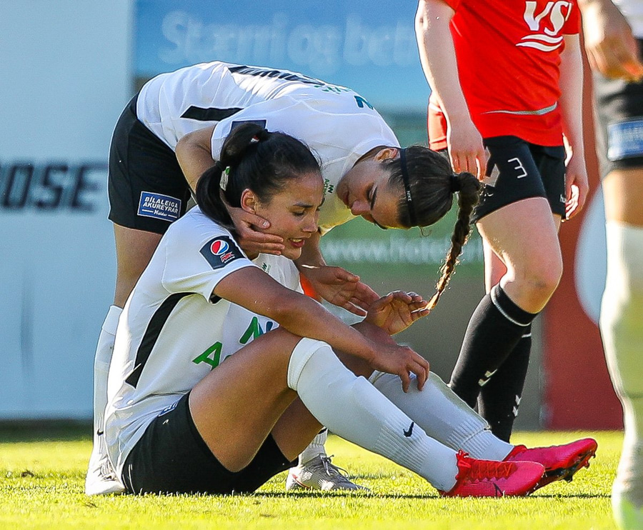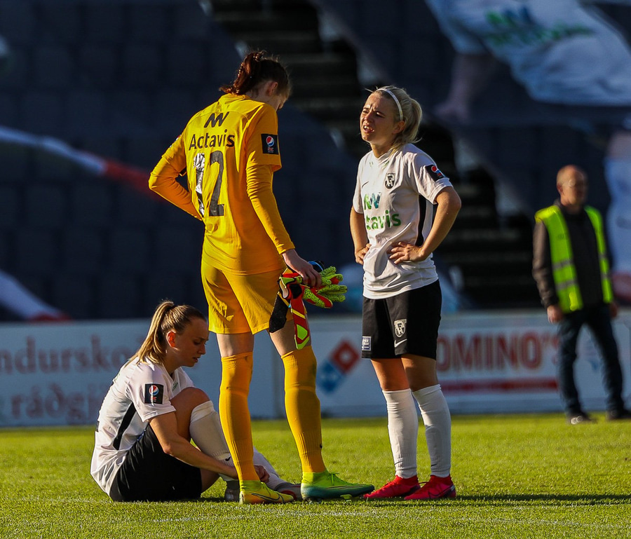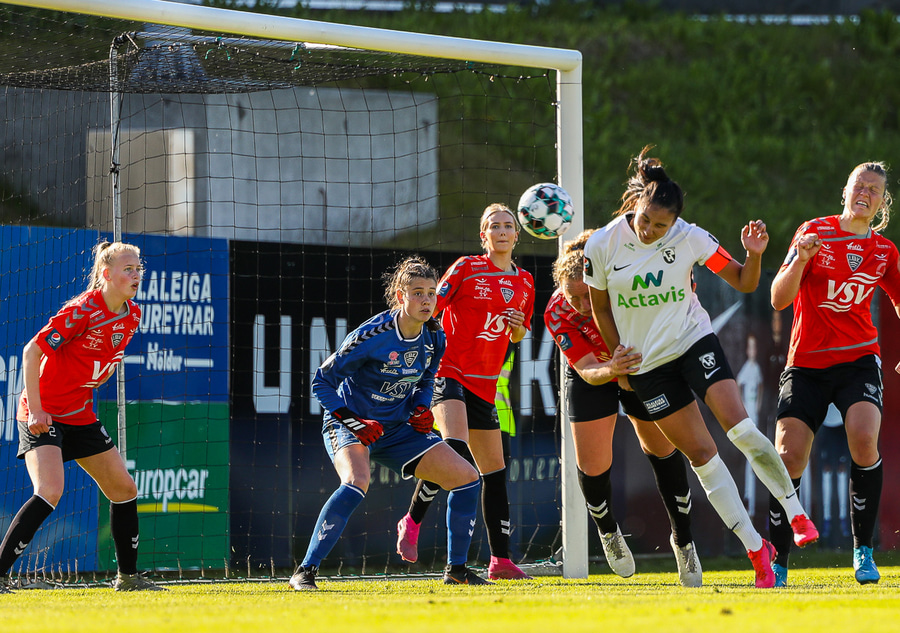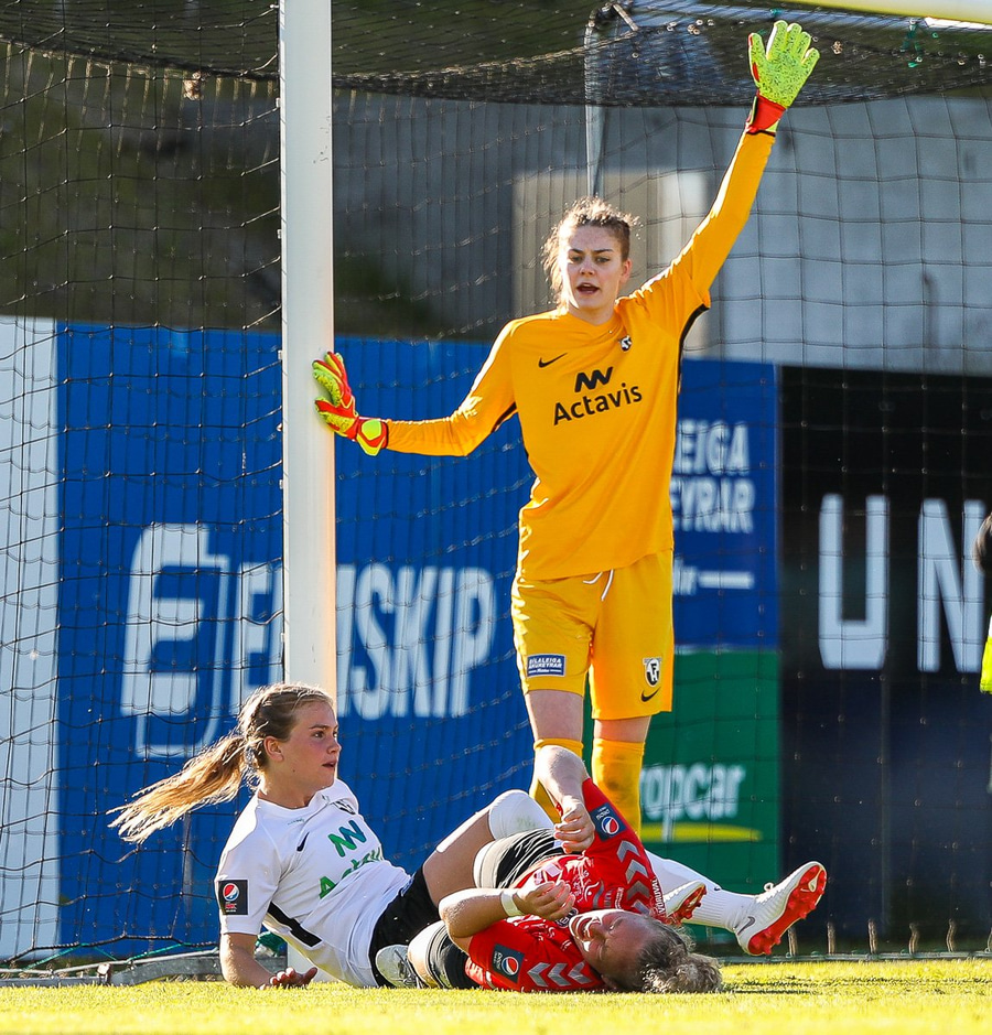 Olga reynir fyrirgjöf sem fer beint í hausinn á Ingibjörgu af stuttu færi. Hún steinlá en er fljót að standa upp aftur. Vonandi er allt í lagi með hana.
