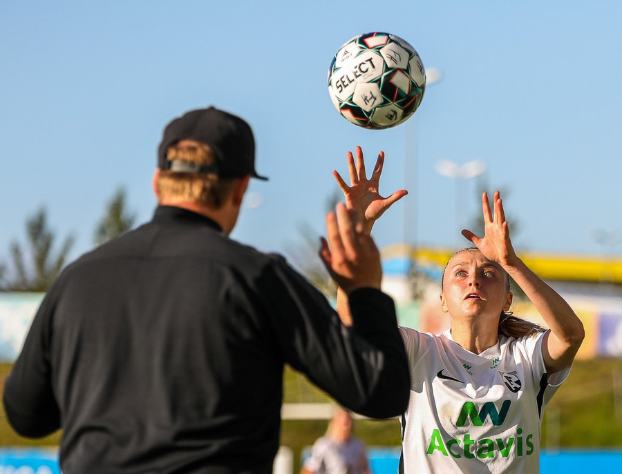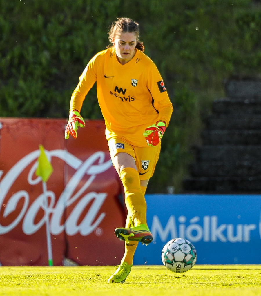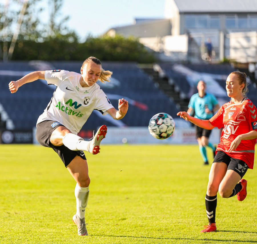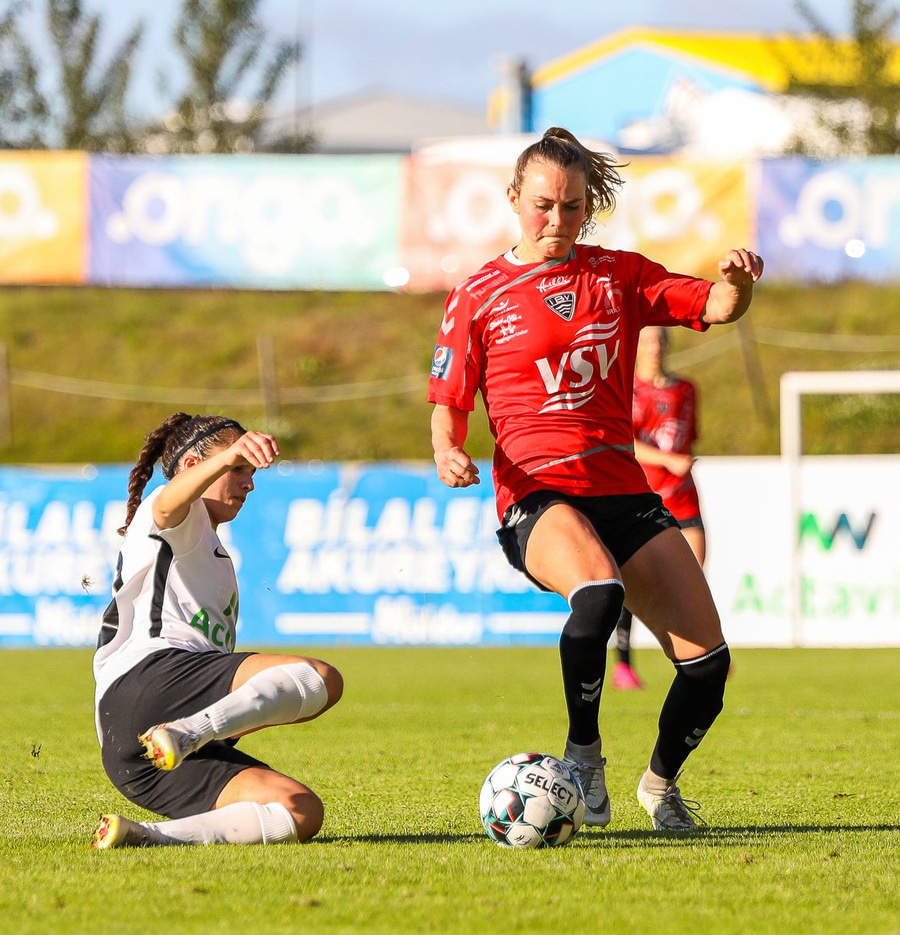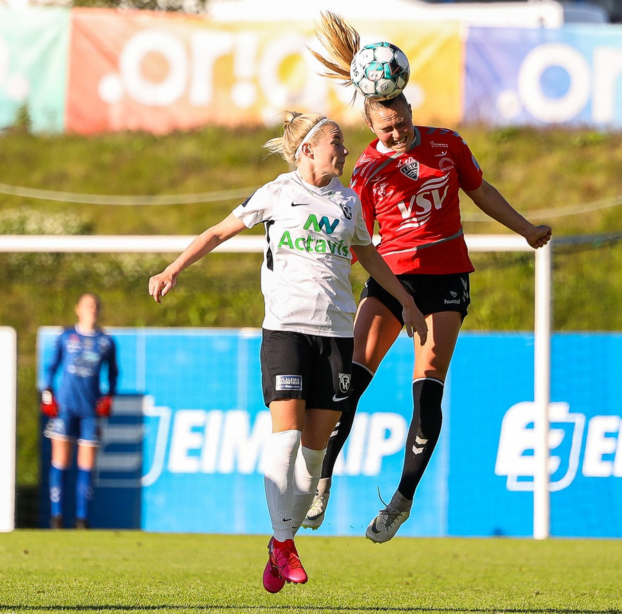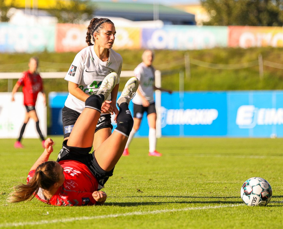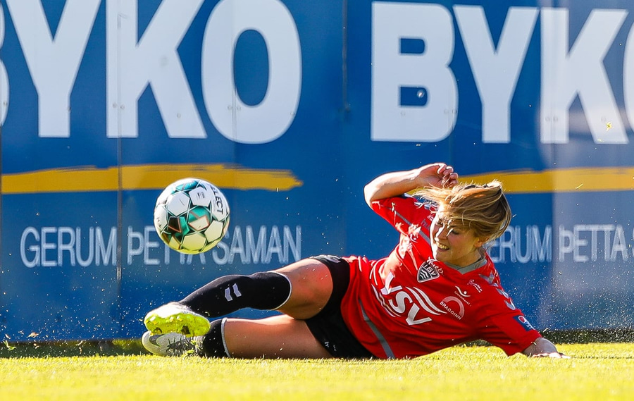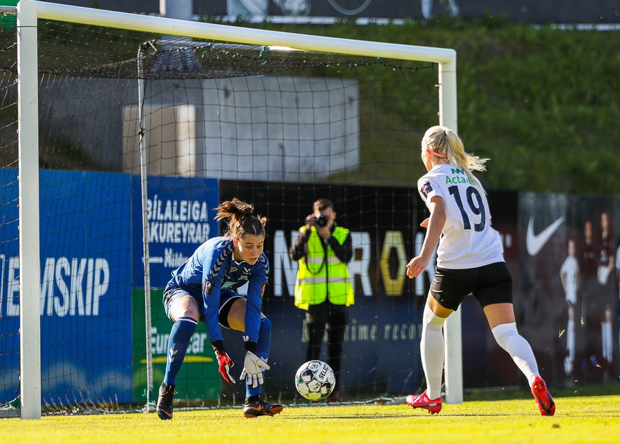 Olga reynir fyrirgjöf sem fer beint í hausinn á Ingibjörgu af stuttu færi. Hún steinlá en er fljót að standa upp aftur. Vonandi er allt í lagi með hana.