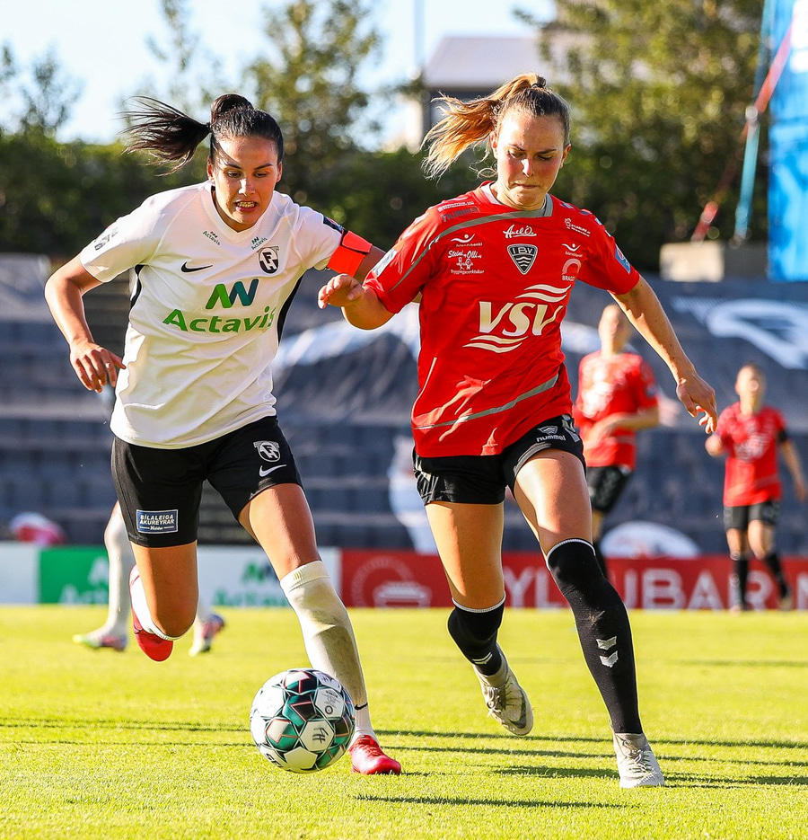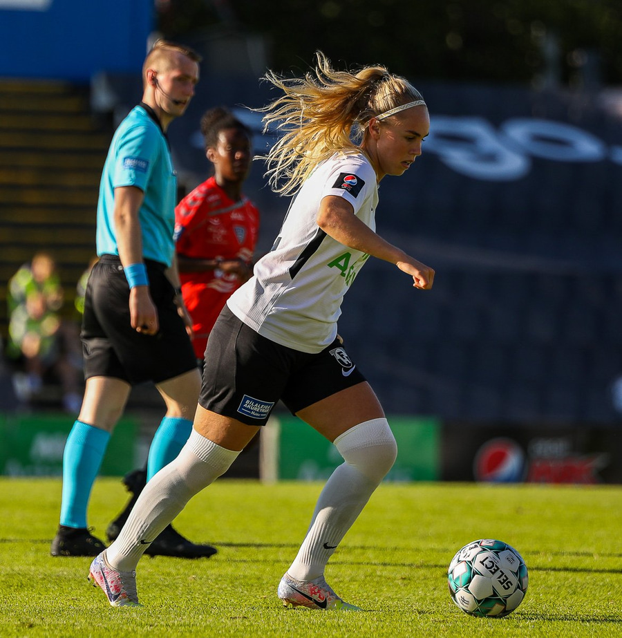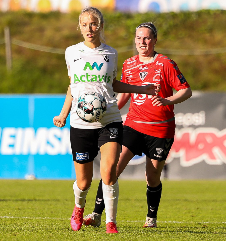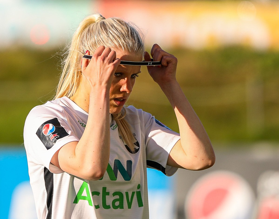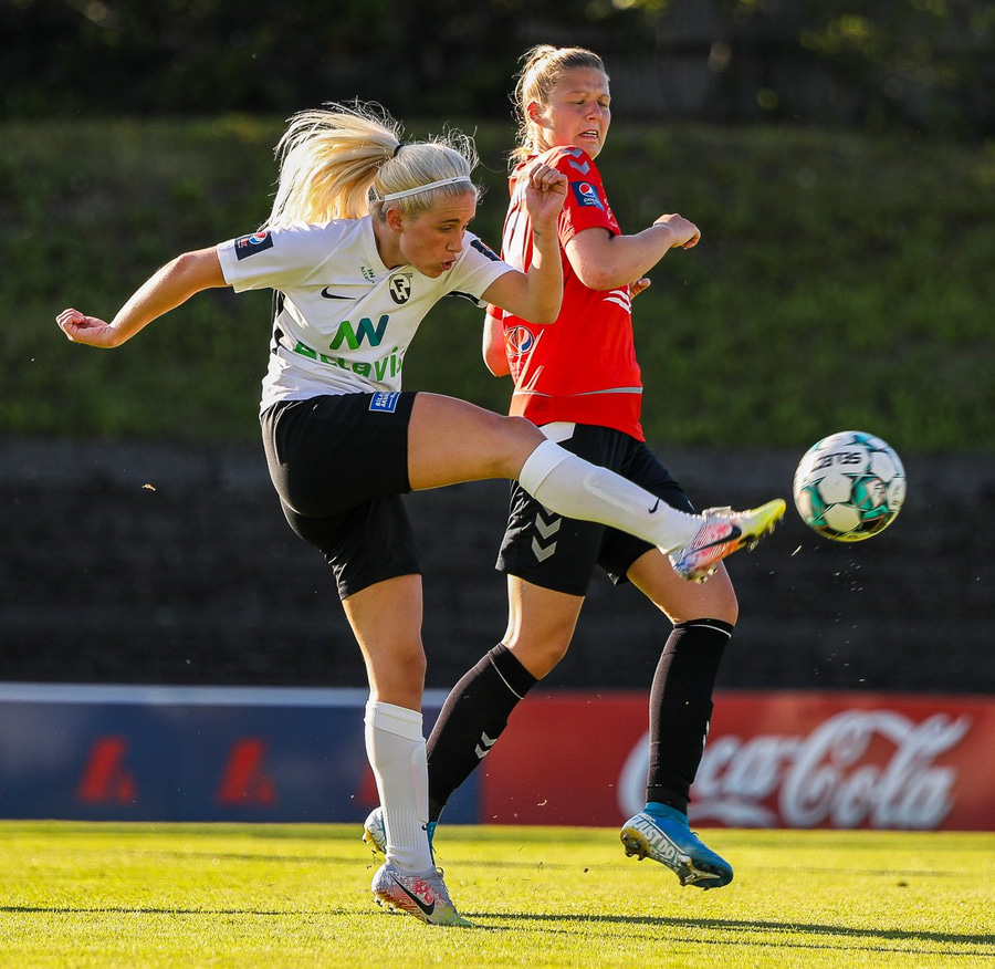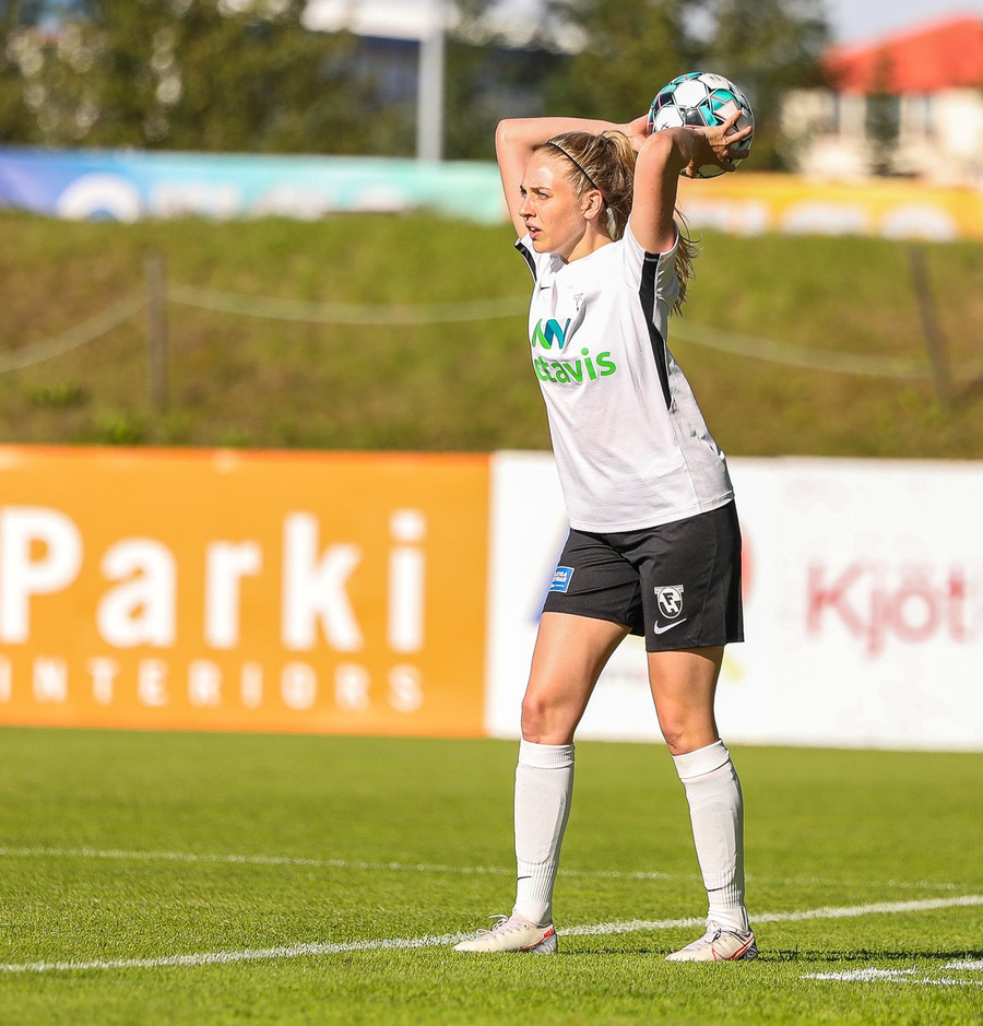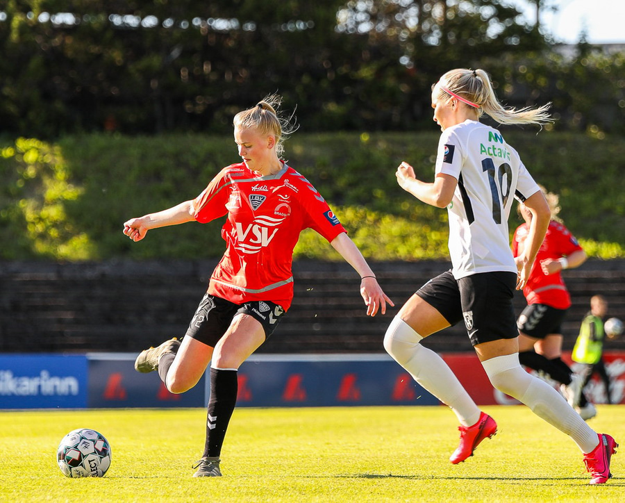 Olga reynir fyrirgjöf sem fer beint í hausinn á Ingibjörgu af stuttu færi. Hún steinlá en er fljót að standa upp aftur. Vonandi er allt í lagi með hana.