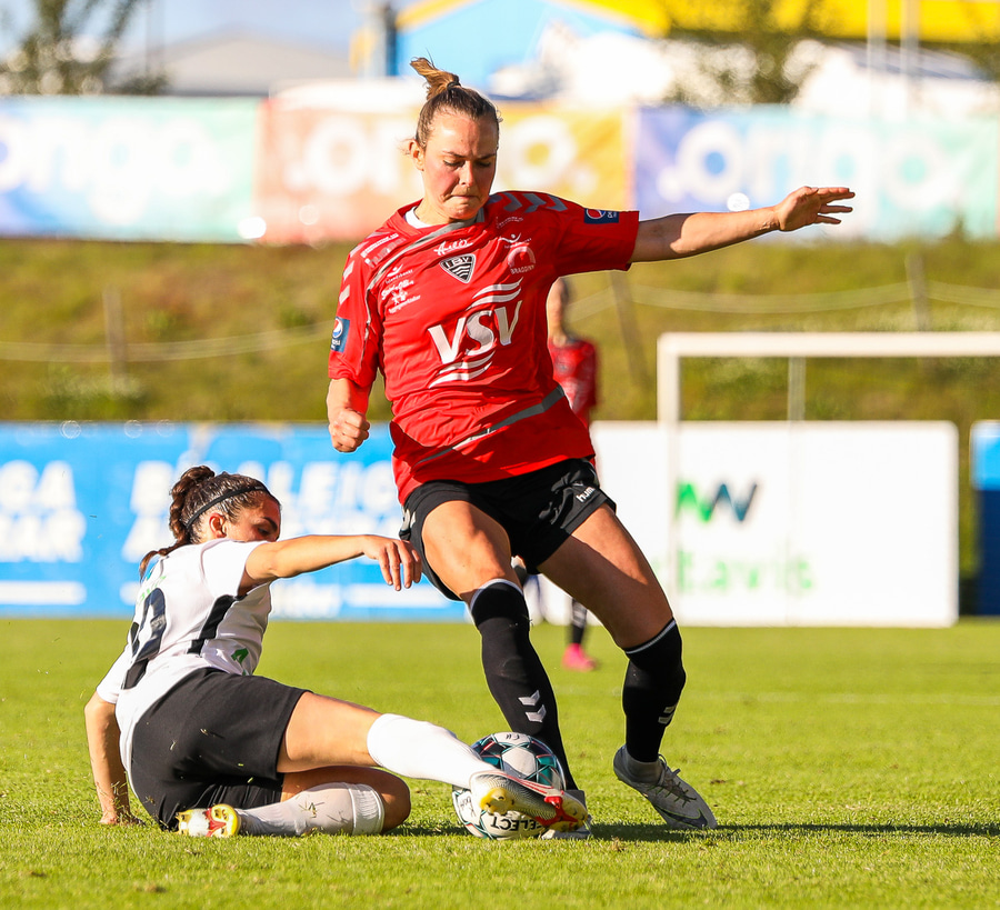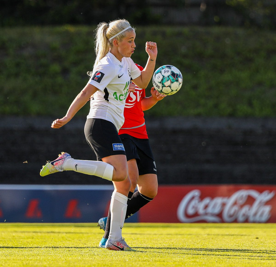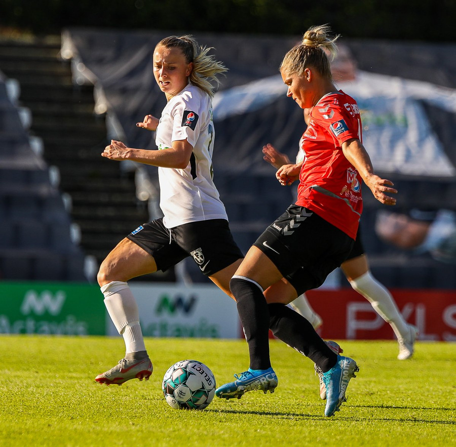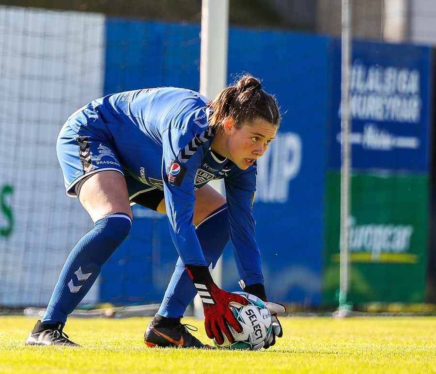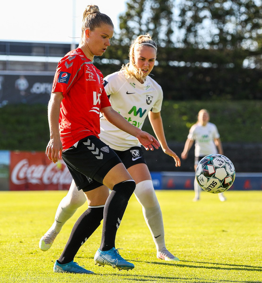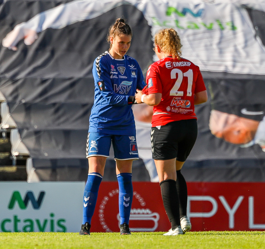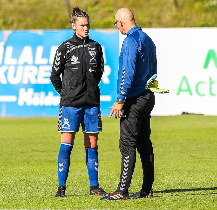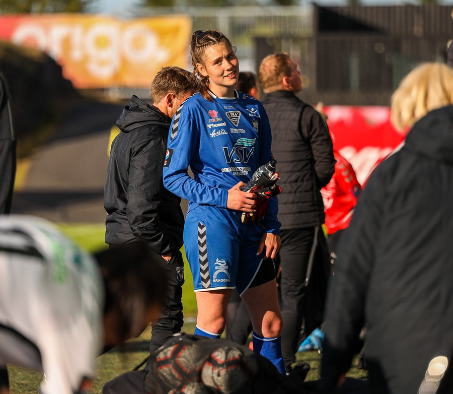 Olga reynir fyrirgjöf sem fer beint í hausinn á Ingibjörgu af stuttu færi. Hún steinlá en er fljót að standa upp aftur. Vonandi er allt í lagi með hana.