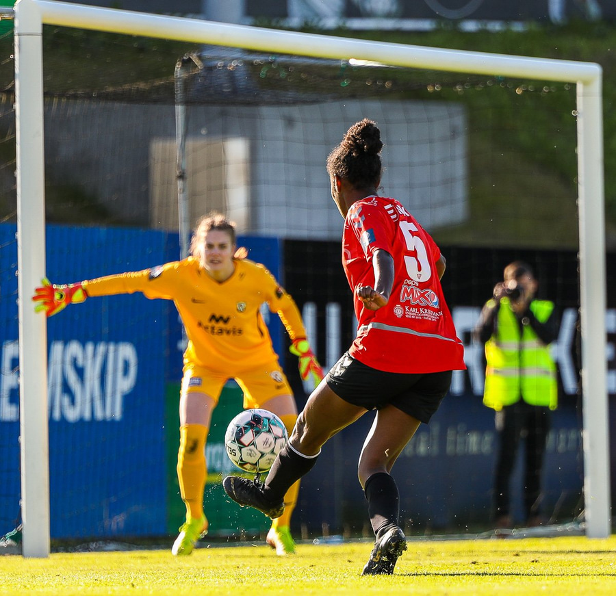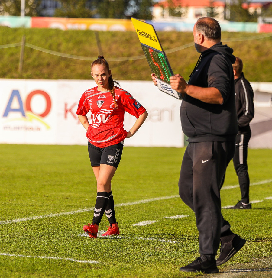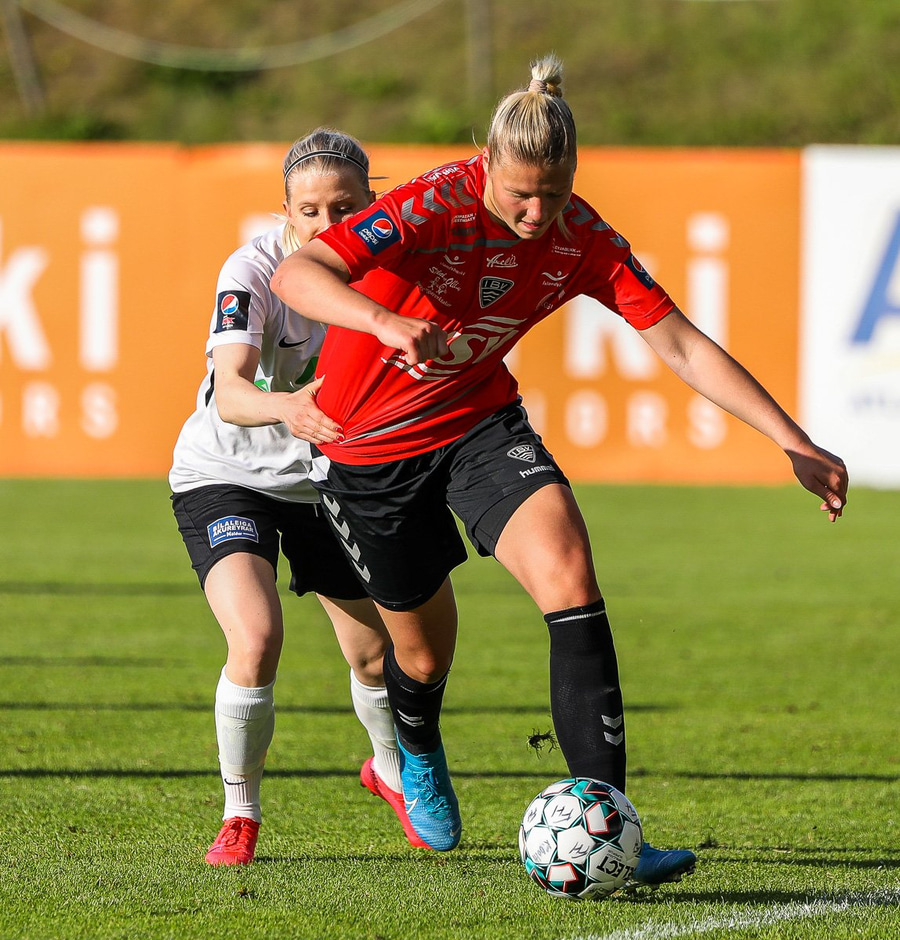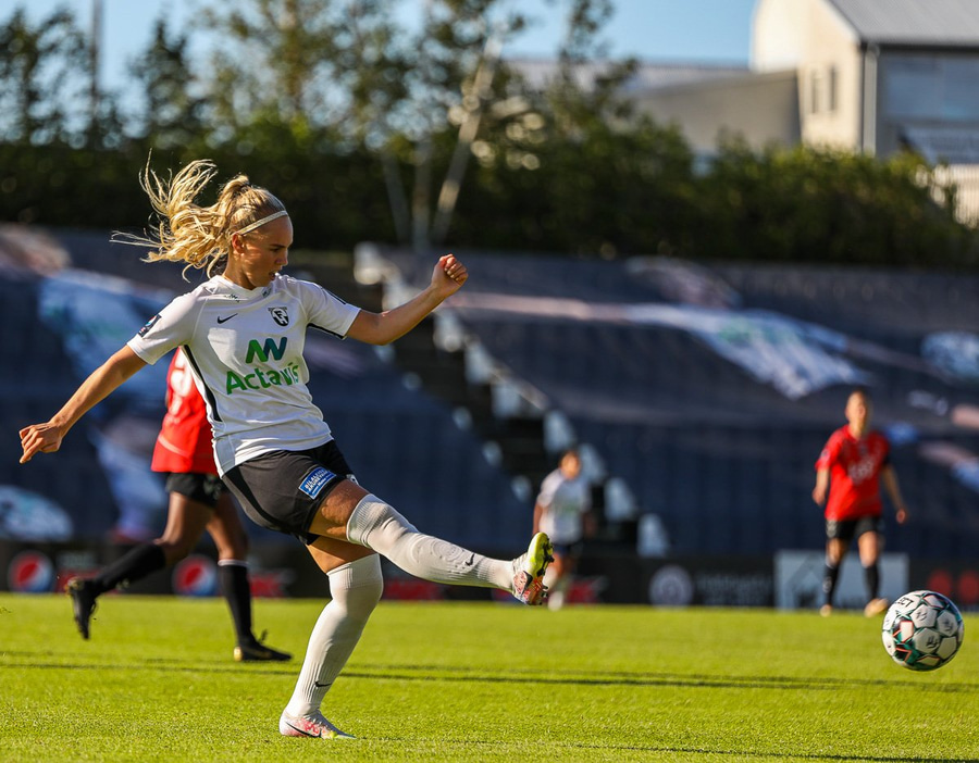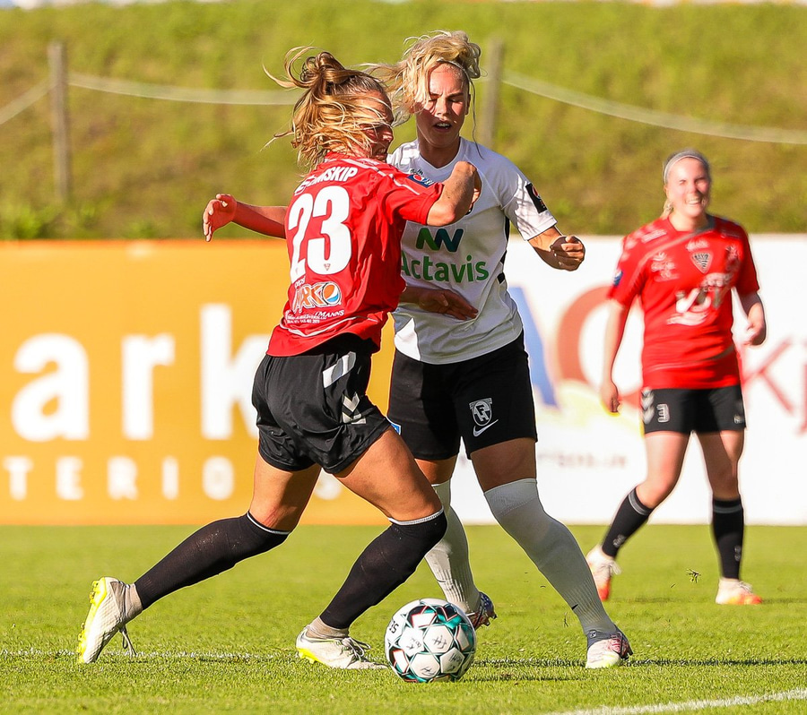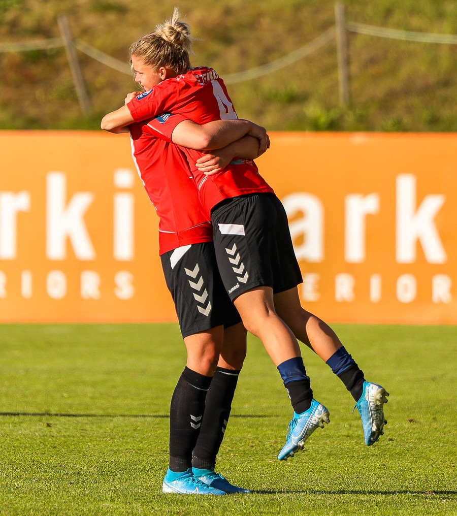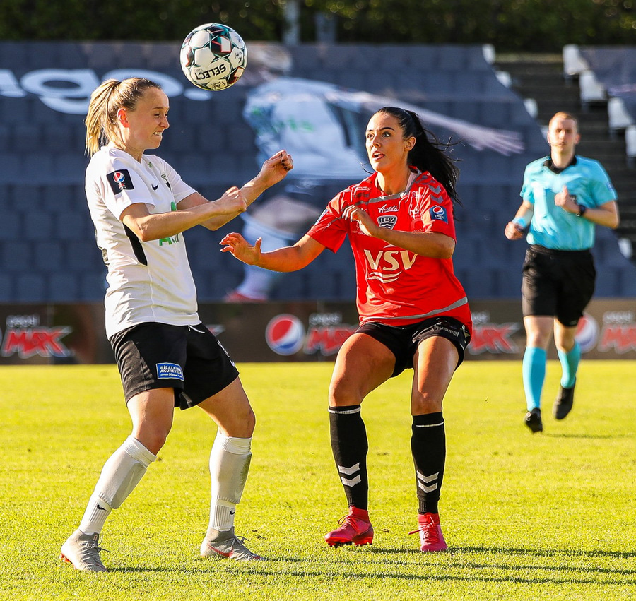 Olga reynir fyrirgjöf sem fer beint í hausinn á Ingibjörgu af stuttu færi. Hún steinlá en er fljót að standa upp aftur. Vonandi er allt í lagi með hana.
