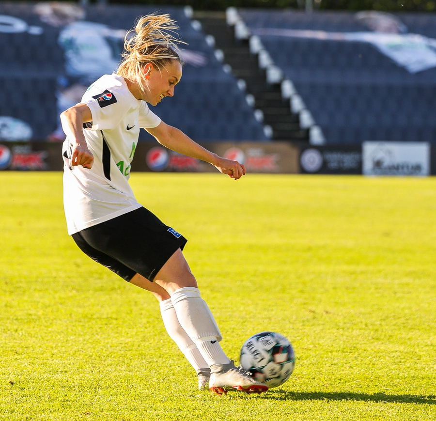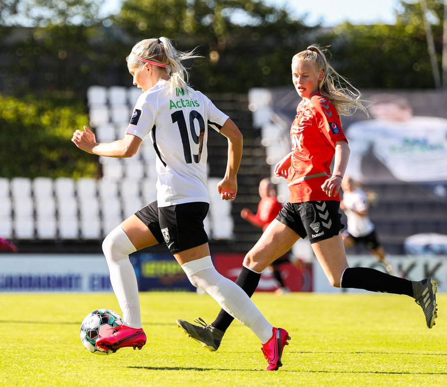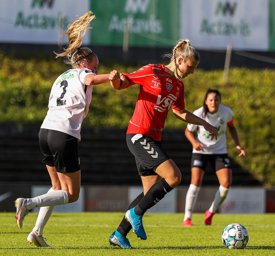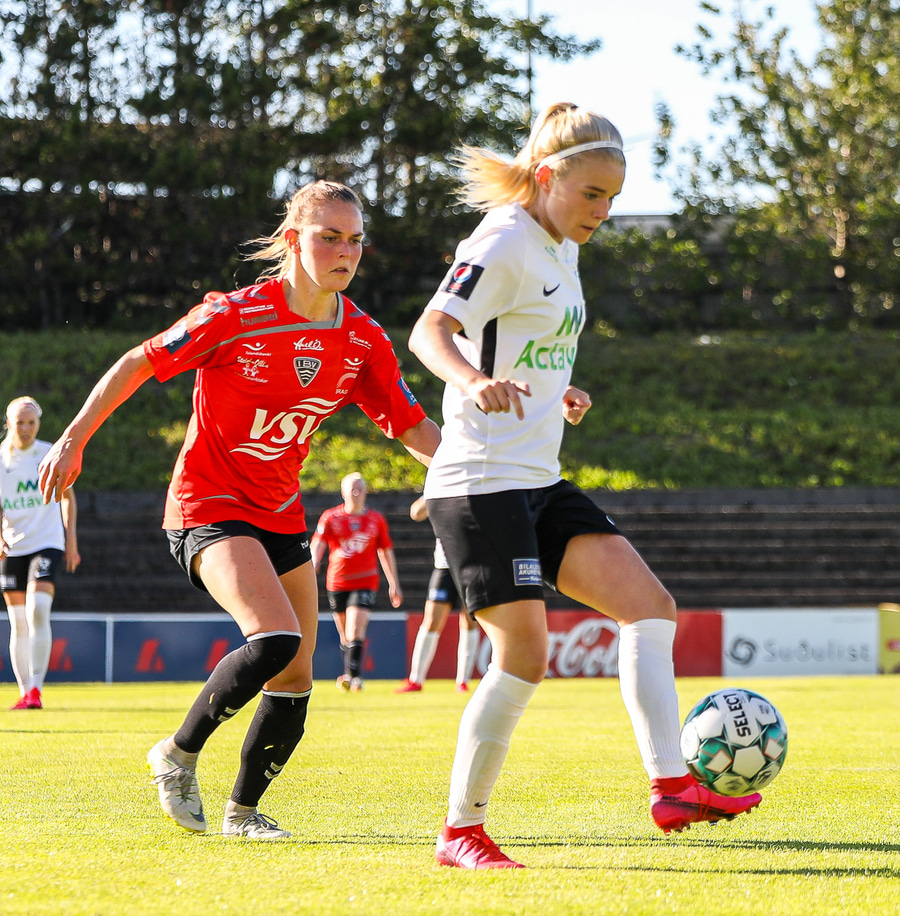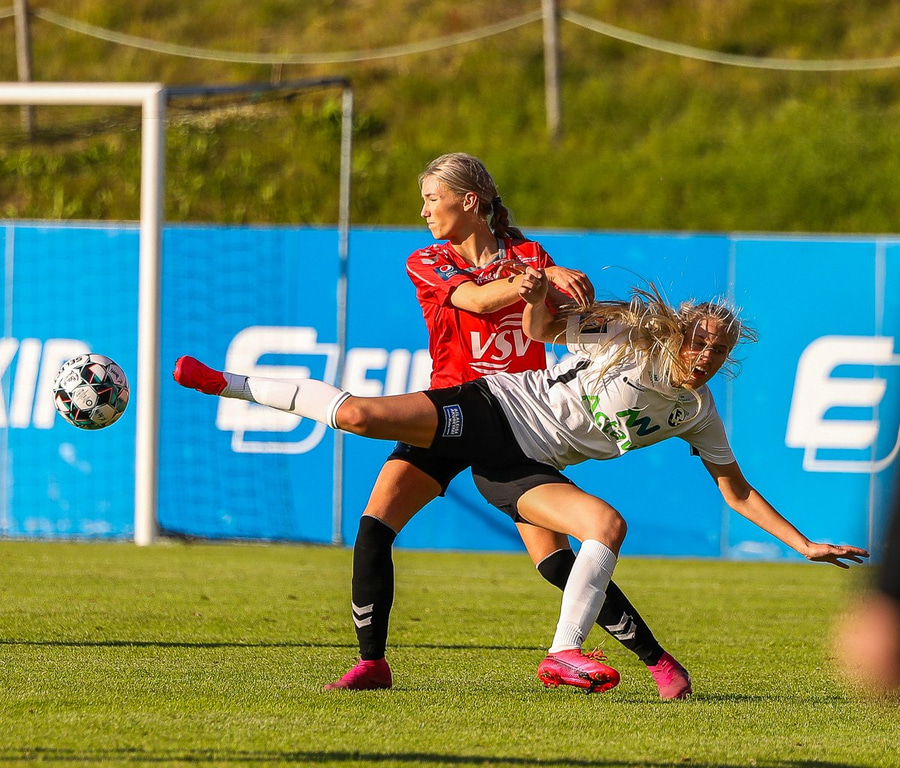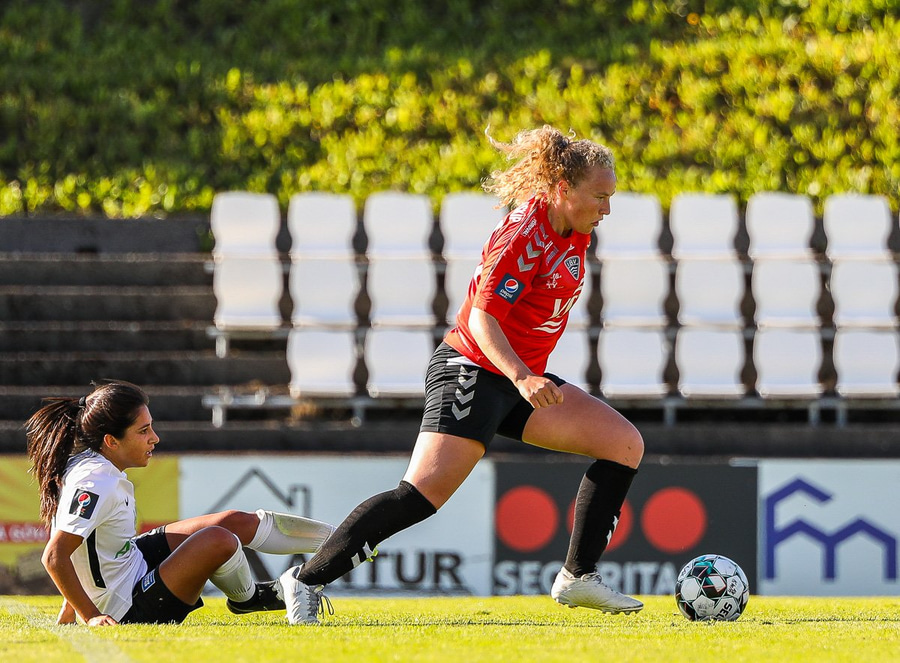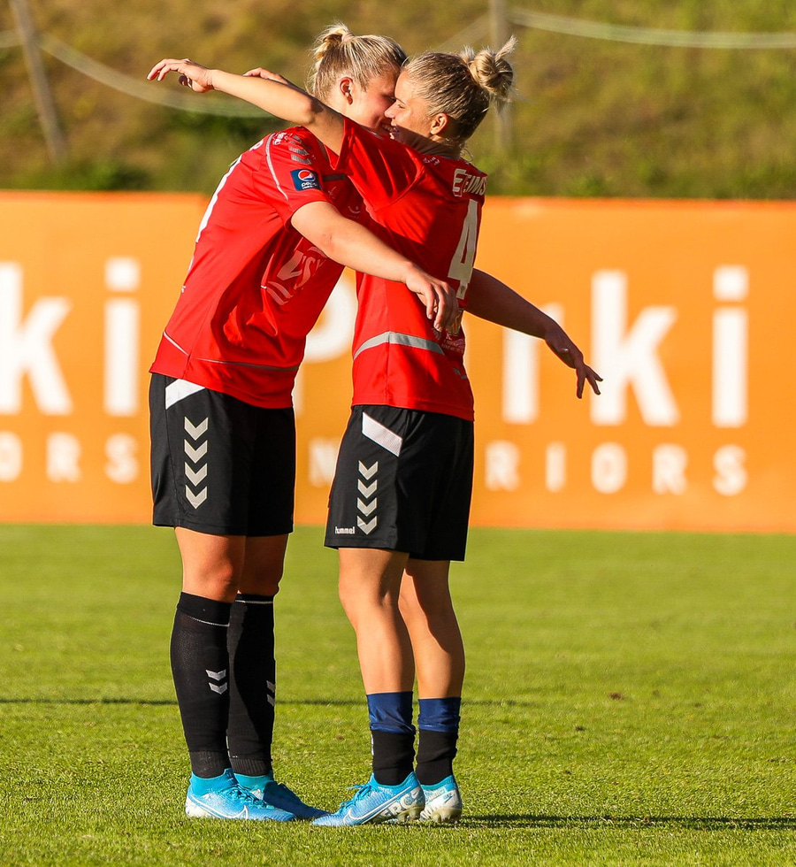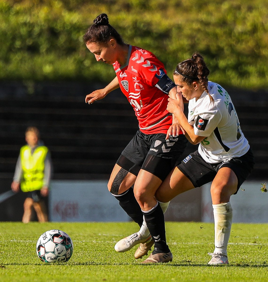 Olga reynir fyrirgjöf sem fer beint í hausinn á Ingibjörgu af stuttu færi. Hún steinlá en er fljót að standa upp aftur. Vonandi er allt í lagi með hana.