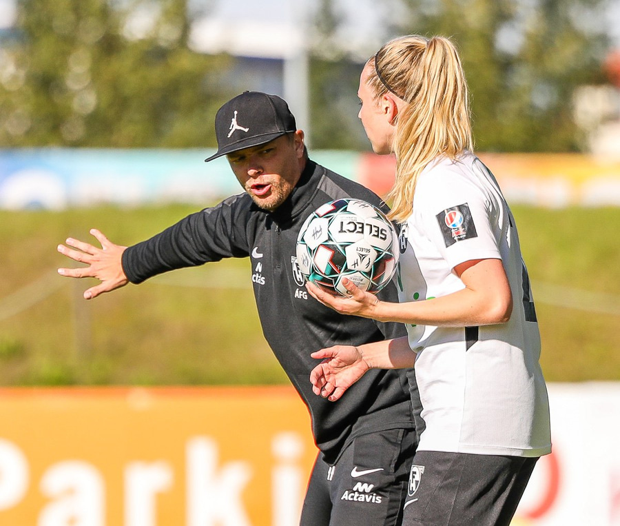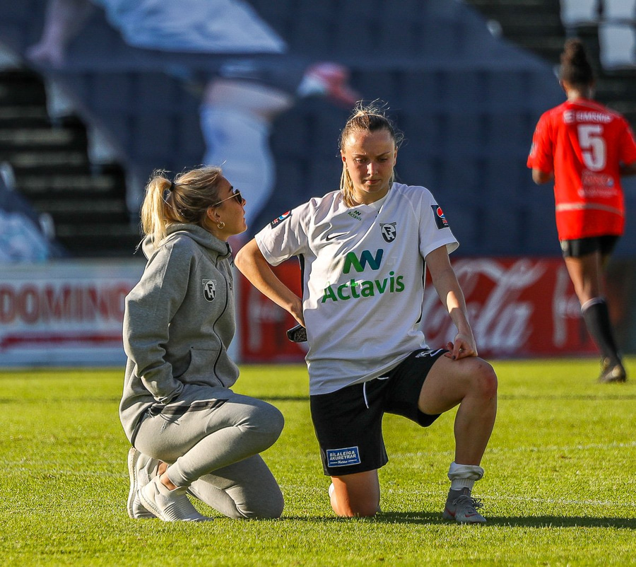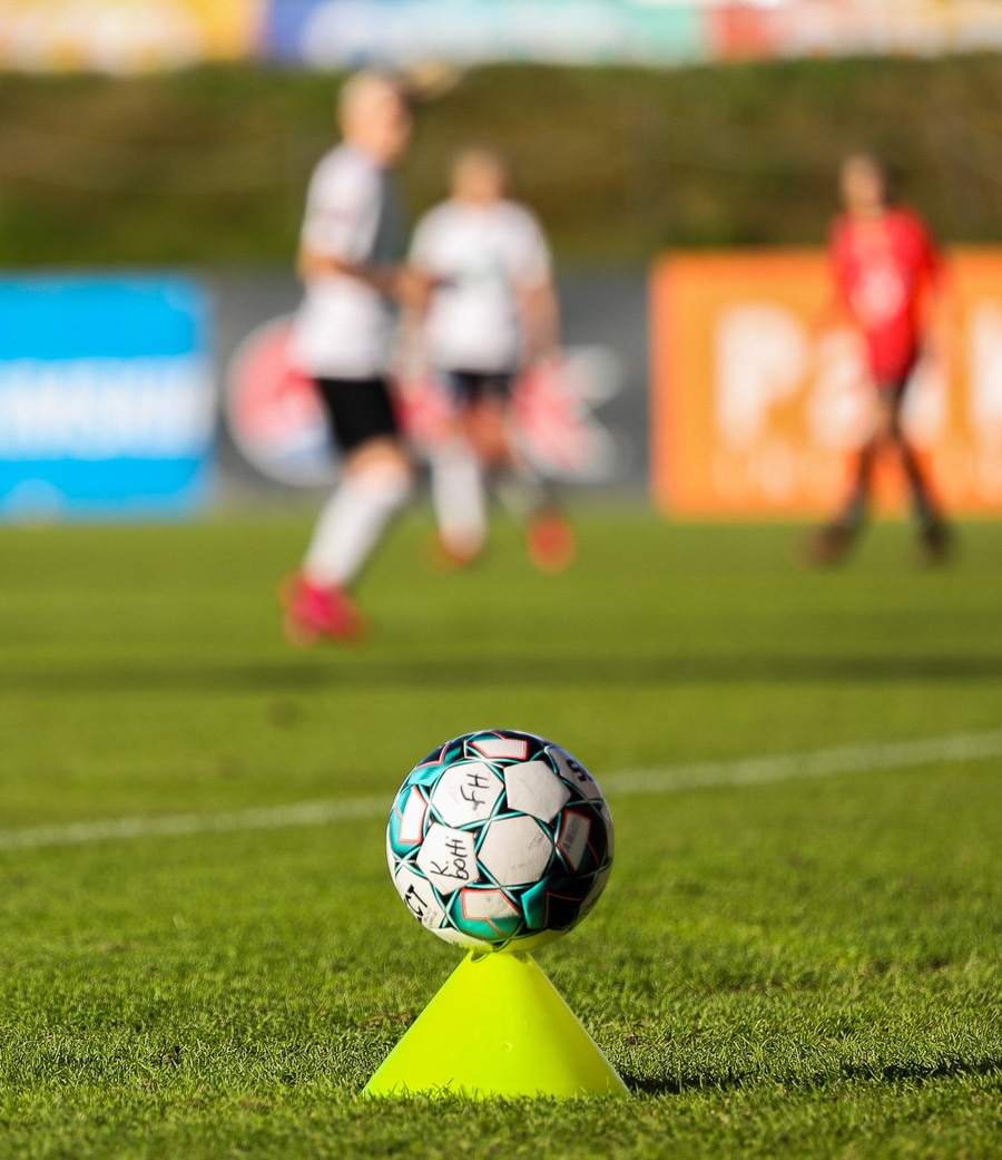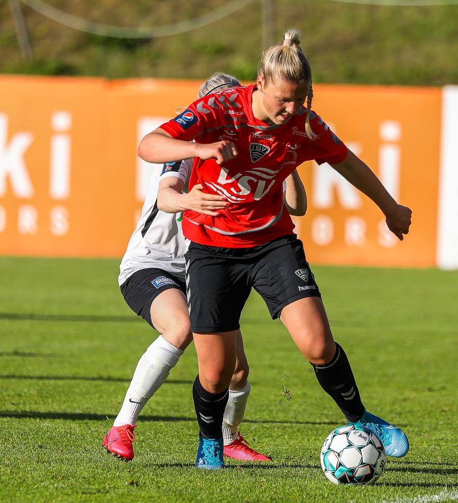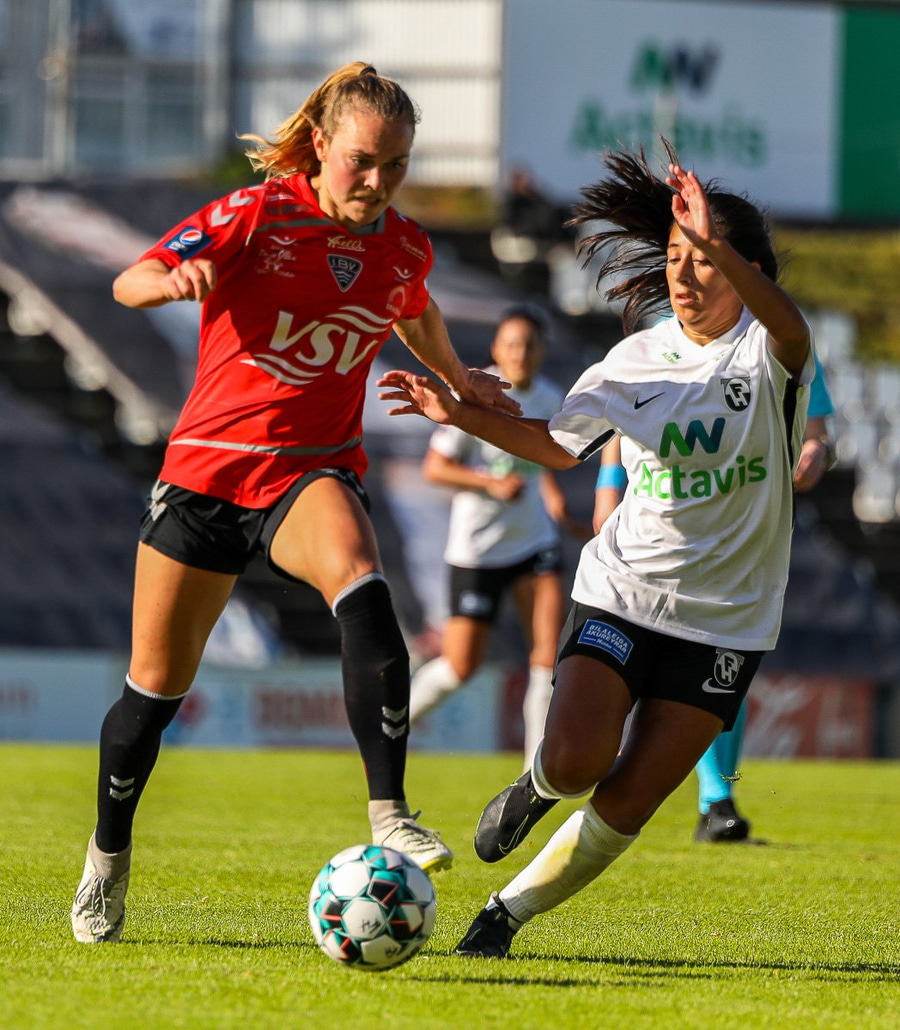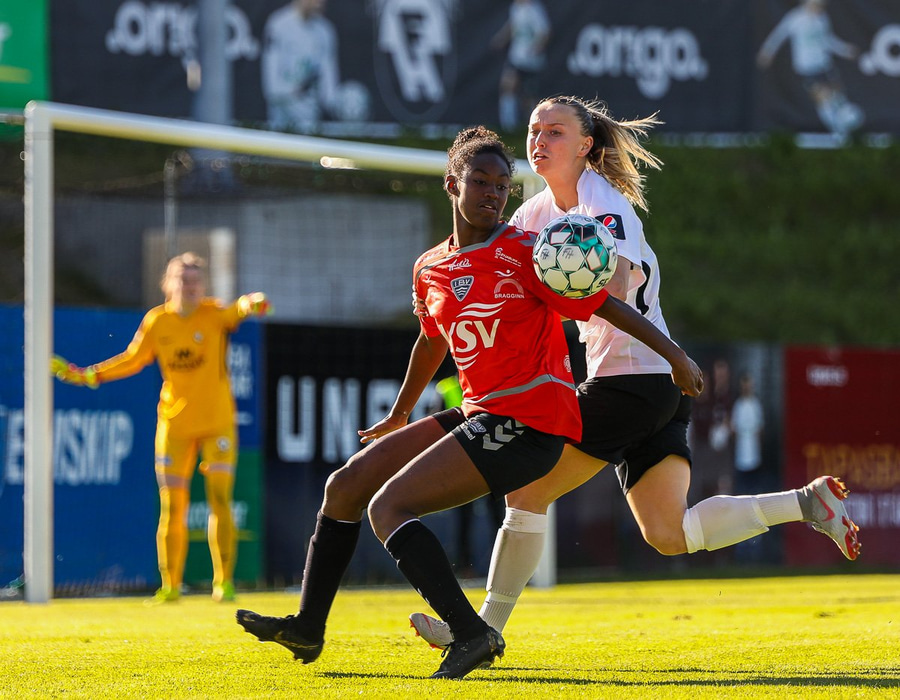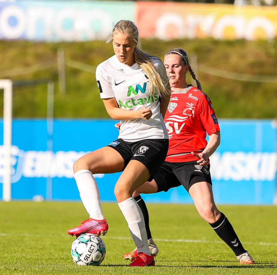 Olga reynir fyrirgjöf sem fer beint í hausinn á Ingibjörgu af stuttu færi. Hún steinlá en er fljót að standa upp aftur. Vonandi er allt í lagi með hana.
