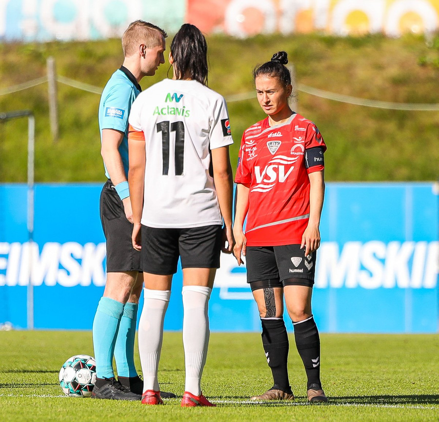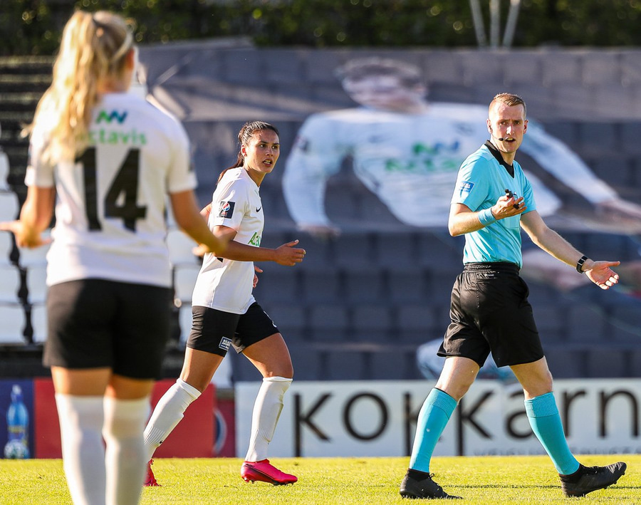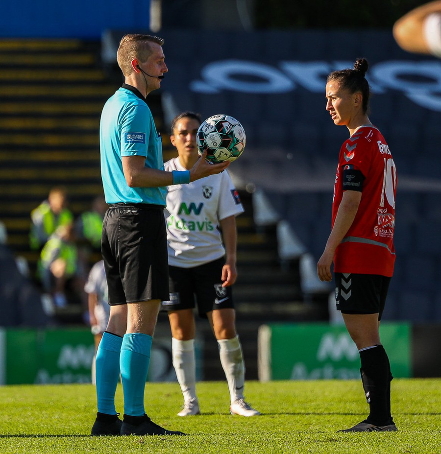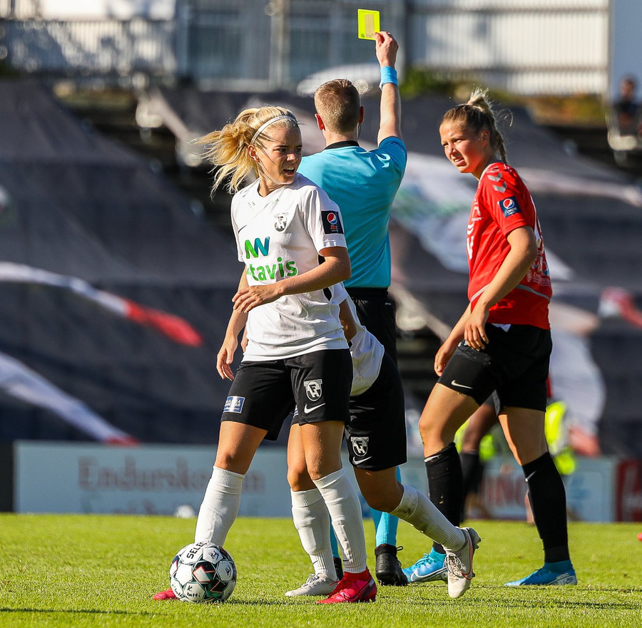 Hrafnhildur fær tiltal frá dómara leiksins eftir að hafa látið hann aðeins heyra það.