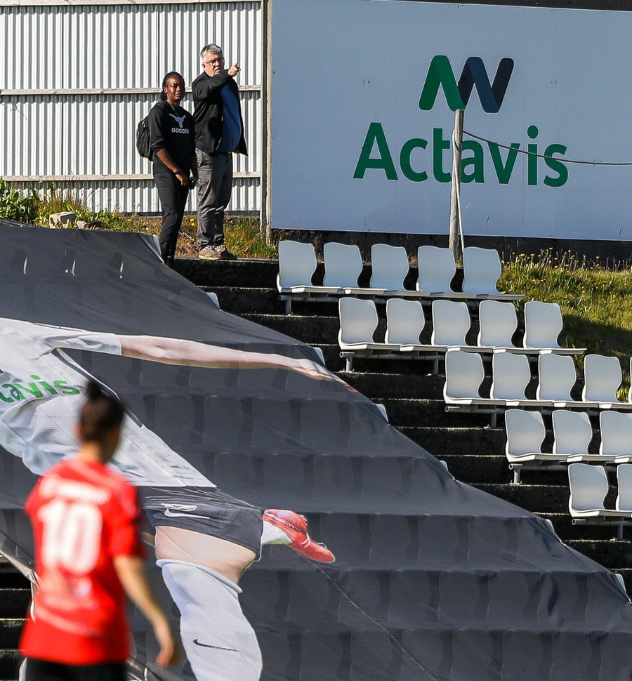 Áhorfendur eru hægt og rólega farnir að koma sér fyrir í stúkunni og þá aðallega neðst þar sem sólin skín.