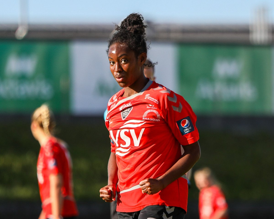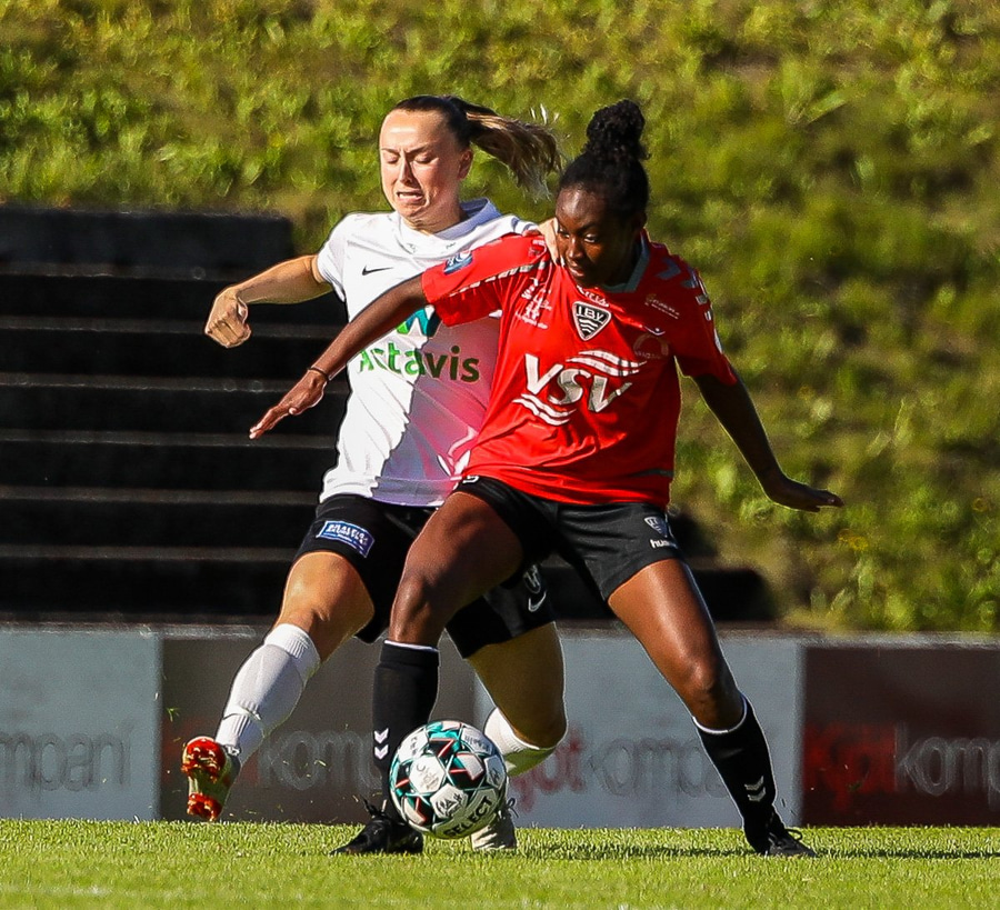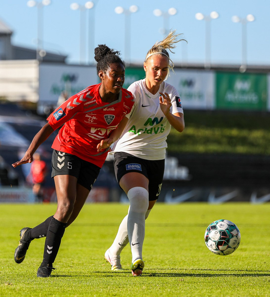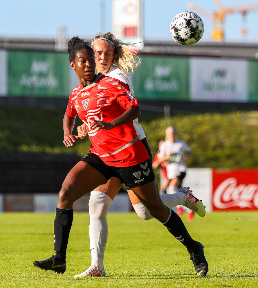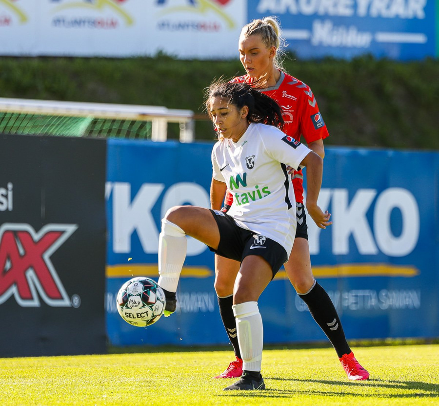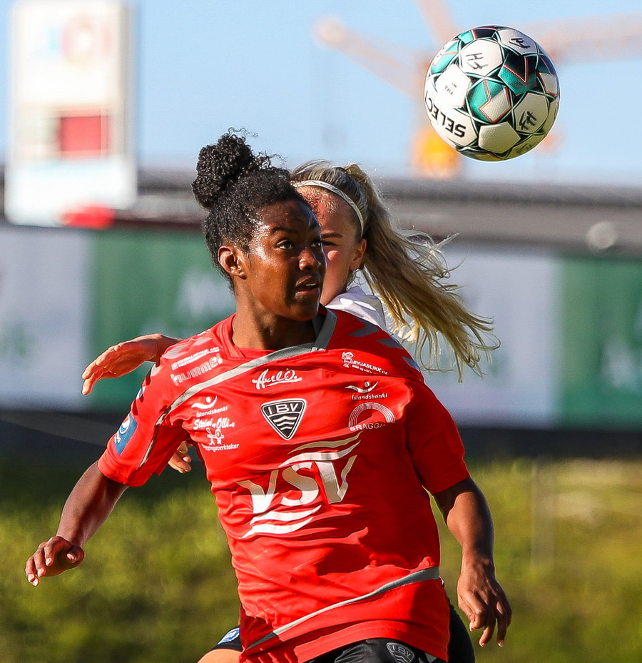 Miyah Watford með boltan ein upp á toppi en Ingibjörg verst vel og tekur af henni boltann.