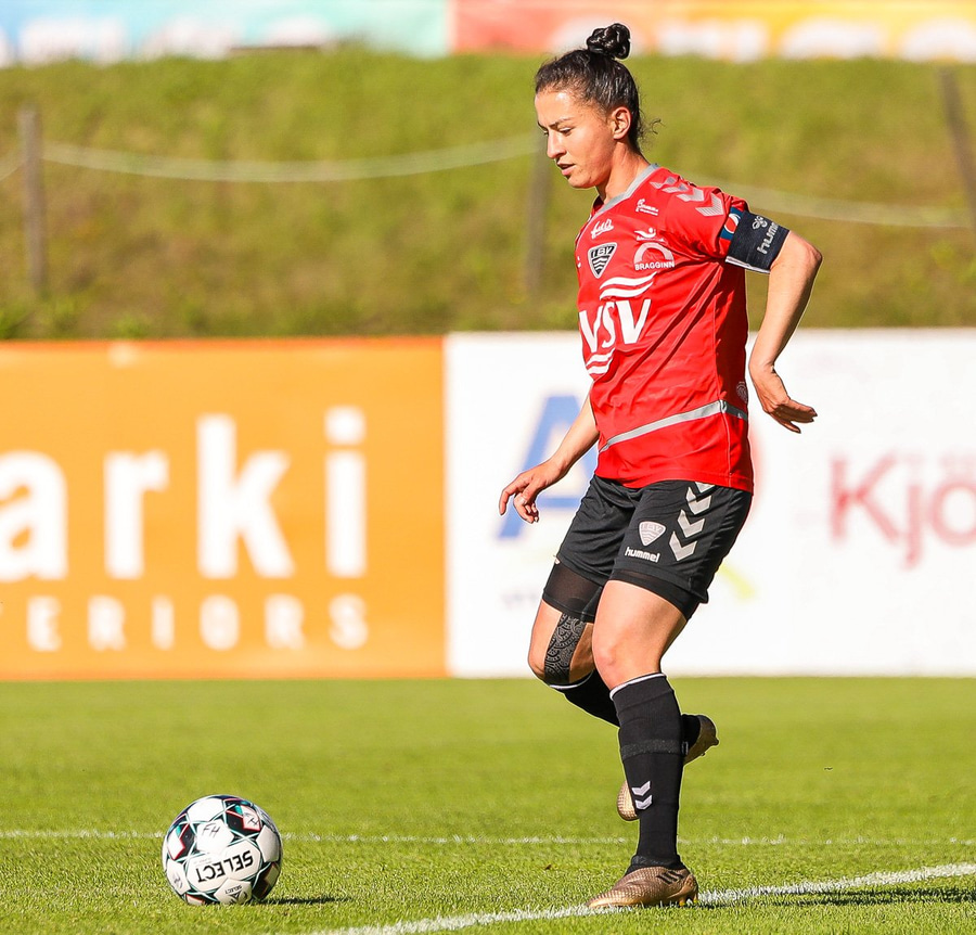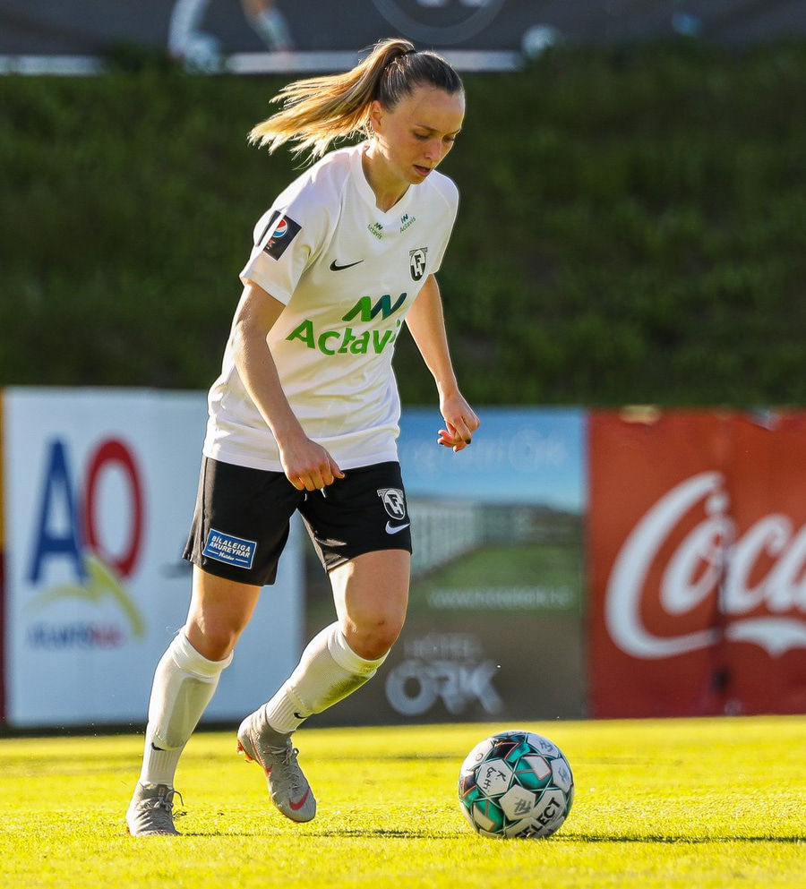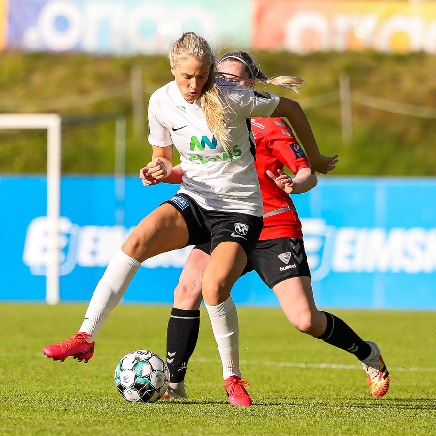 Brýtur á Evu Núru á miðjum vallarhelmingi ÍBV.