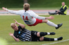 Jónas fer upp í bolta á móti Tómasi. Jónas lendir illa og sömu sögu má segja af Tómasi. Tómas þarf á aðhlynningu að halda.