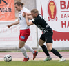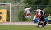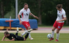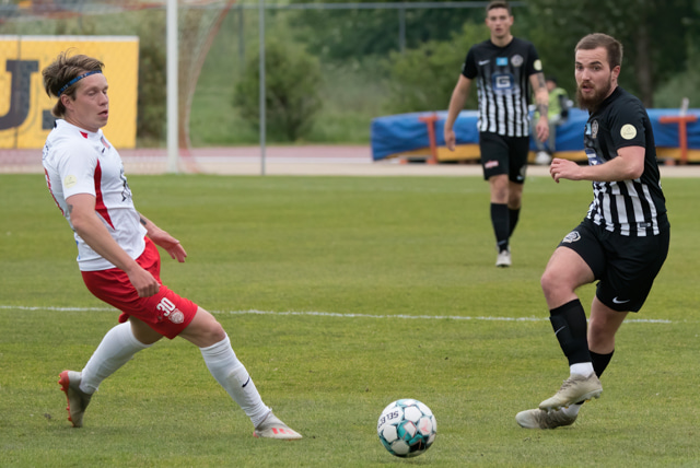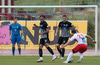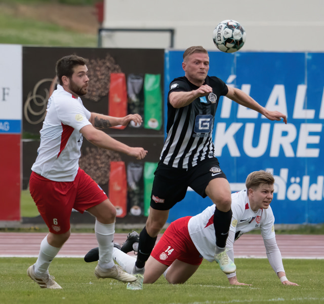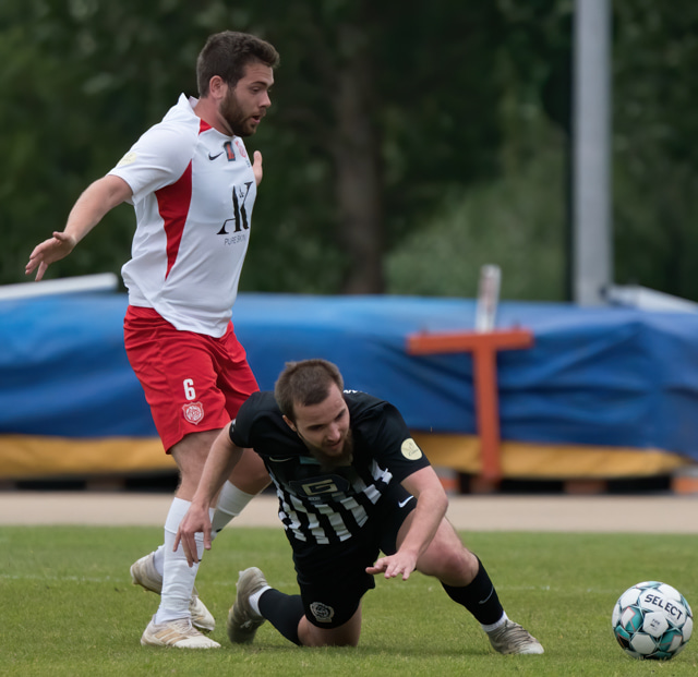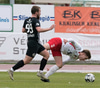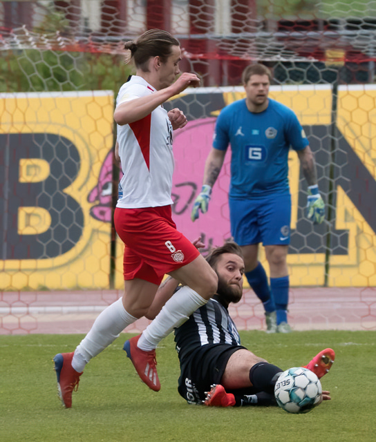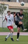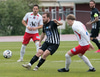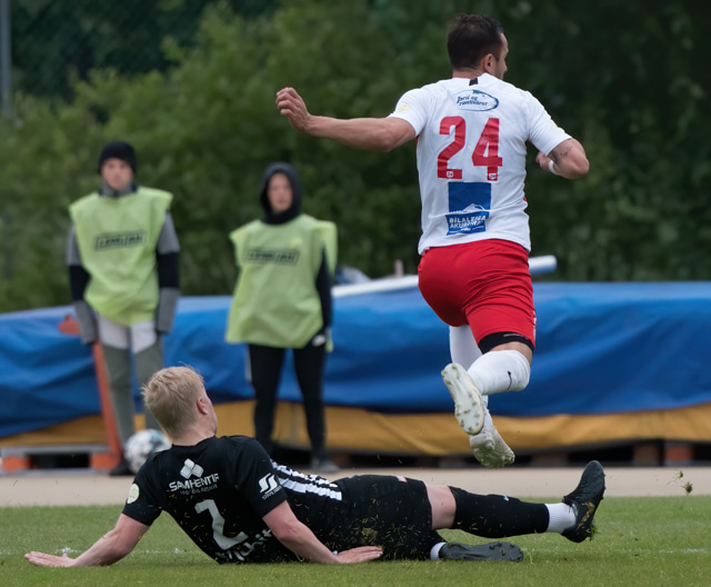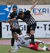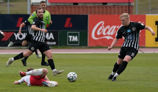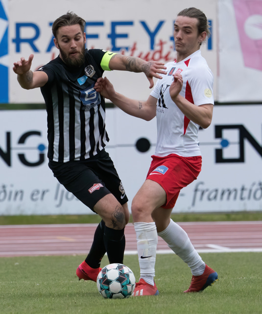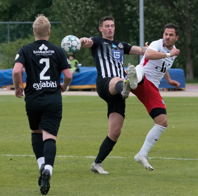 Elmar fær boltann í bakið og sendir Kairo á sprett. Loftur og Hermann stöðva þessa sókn inn á teignum með því að renna sér fyrir skot frá Kairo.