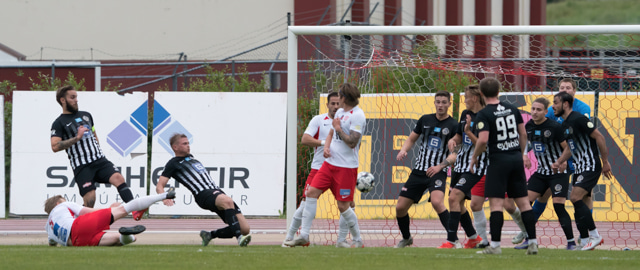 Bjarki með skot sem Stubbur ver. Skotið kom eftir laglega sendingu frá Jónasi. Þórsarar fá svo horn.
