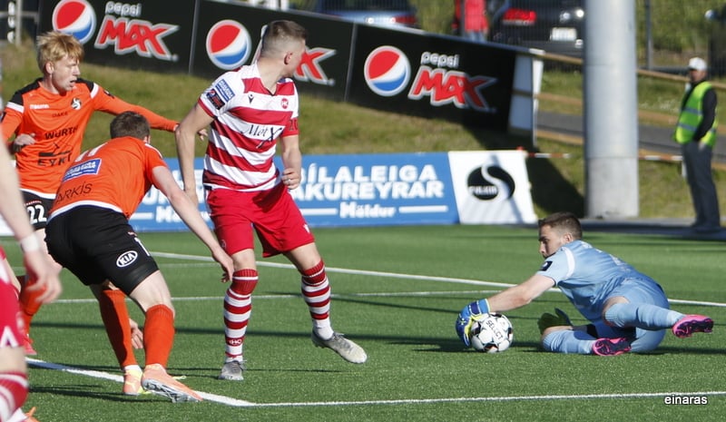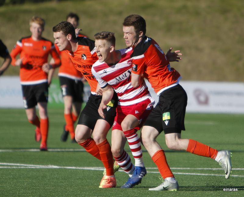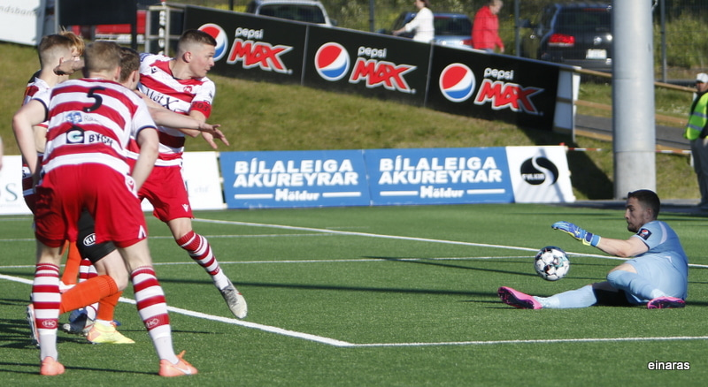 Afar sérstakt mark í undirbúning en laglega klárað. Ívar Örn virðist missa boltann full langt frá sér en Arnar Sveinn bakkar frá boltanum áður en Ívar Örn kemur með flottan bolta fyrir markið þar sem Valgeir mætir á fjær og klárar.