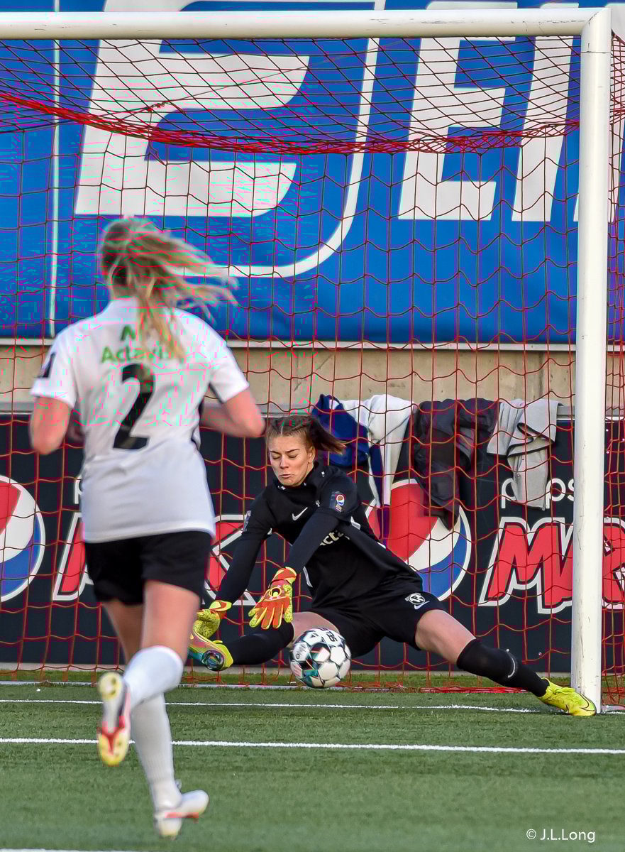 Spyrnan mjög góð en Telma vel vakandi, mætir út og grípur þennan bolta.