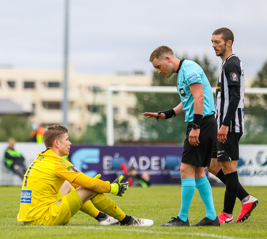 Hannes Þór er à rauðri innanundir peysu við alhvÃtan búning. Er búið að láta 4. deildardómara landsins vita? âš½ï¸