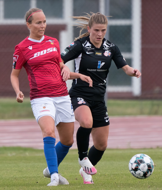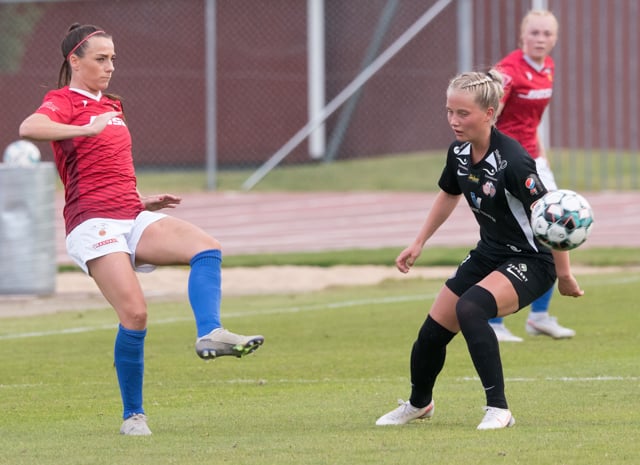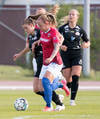 Hulda Ósk gerir mjög vel úti hægra megin en er loks stöðvuð af þriðja varnarmanni.