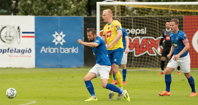 Hallgrímur reynir skot fyrir utan teig sem er hátt yfir markið. Ívar var að koma í hlaupinu vinstra meginn við hann og hefði mögulega verið álitlegri kostur.