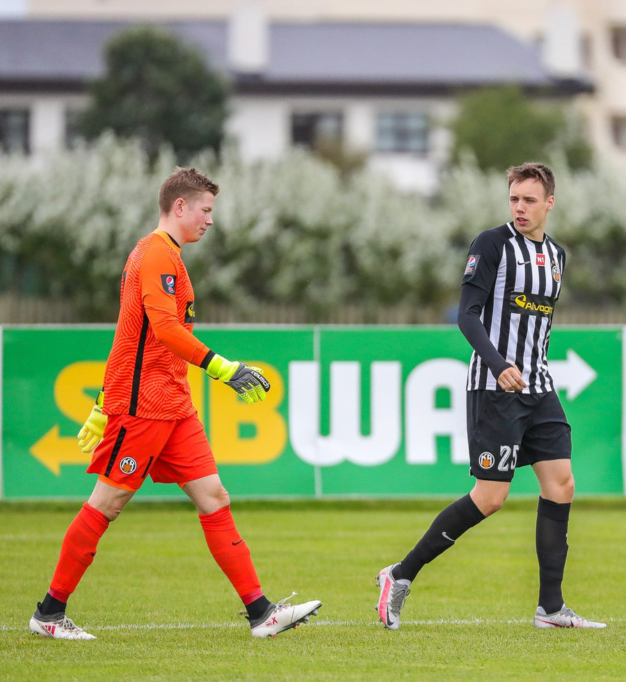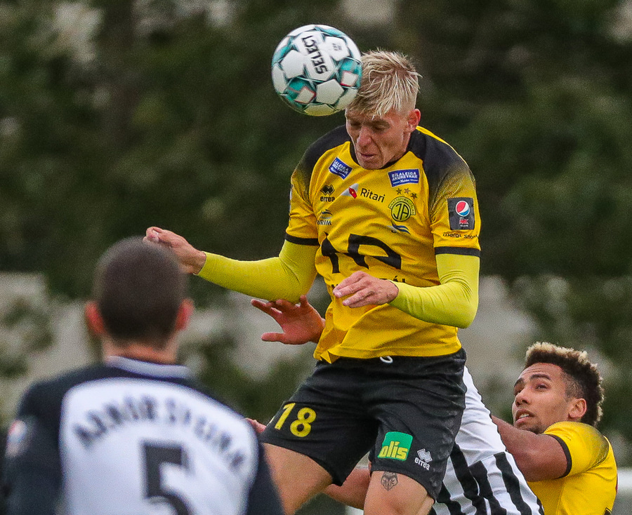 Ísak Snær fer með hendurnar í skallabaráttu við Finn Orra og hittir hann í andlitið sýnist mér, fær gott tiltal frá Ella.