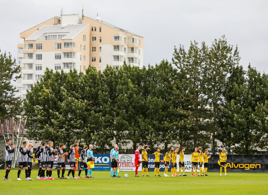 Jón Gísli straujar Óskar Örn rétt fyrir utan vítateig og fær gult spjald, þessi aukaspyrna er á stórhættulegum stað!