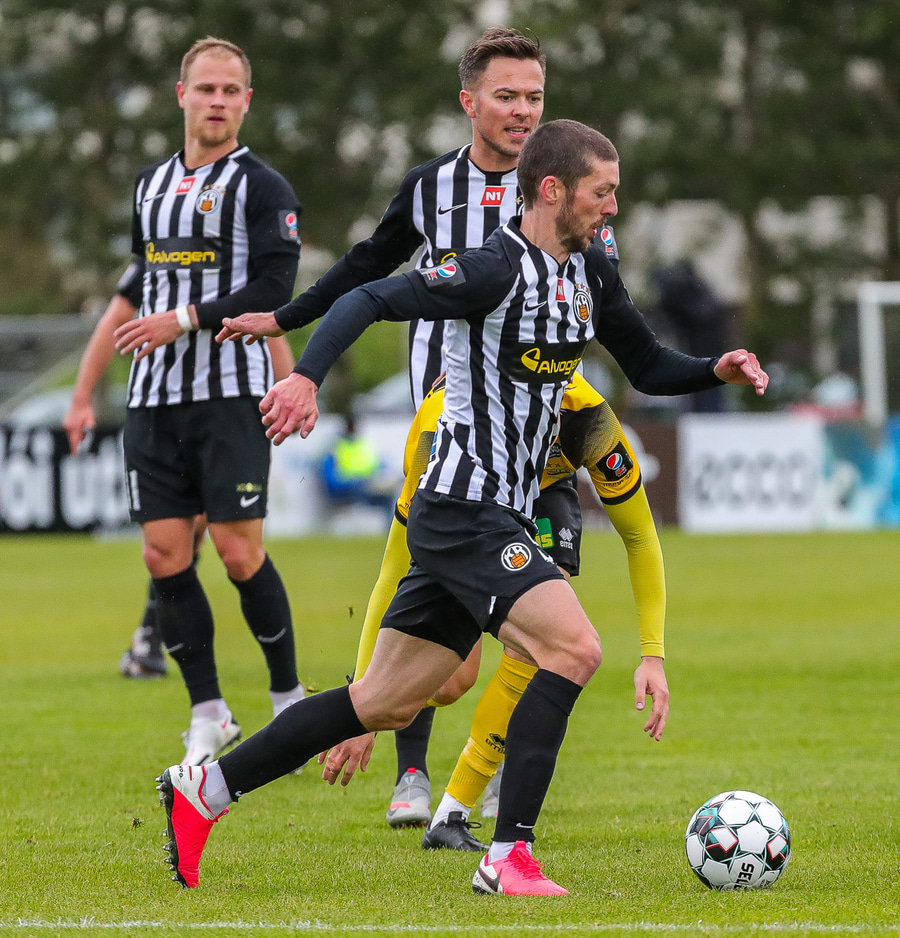 Tryggvi reynir fyrirgjöf en Kennie gjörsamlega hendir sér fyrir hana og bjargar að boltinn komist inn í teiginn.