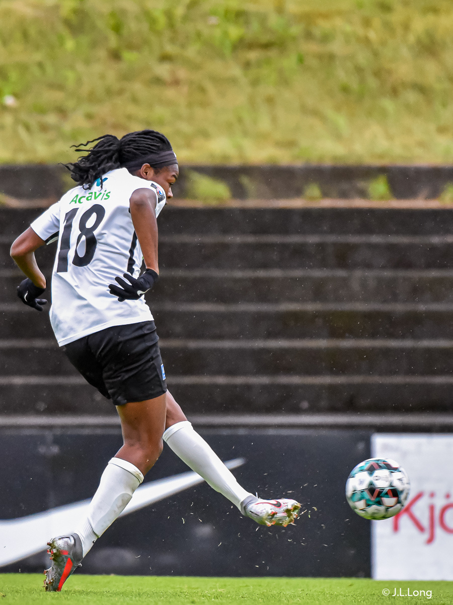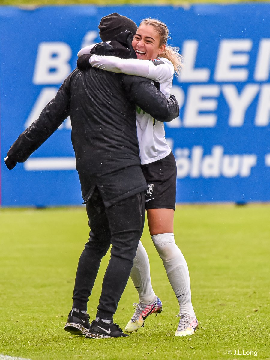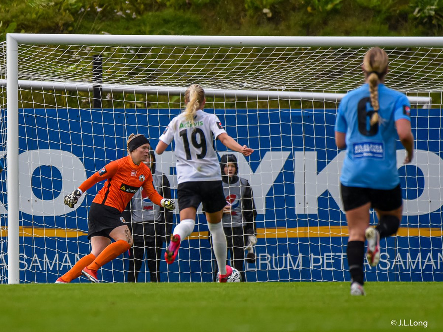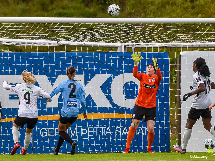 Valgerður með langan bolta inn á Phoenetiu sem klárar laglega í hægra hornið og það lifnar verulega yfir stúkunni