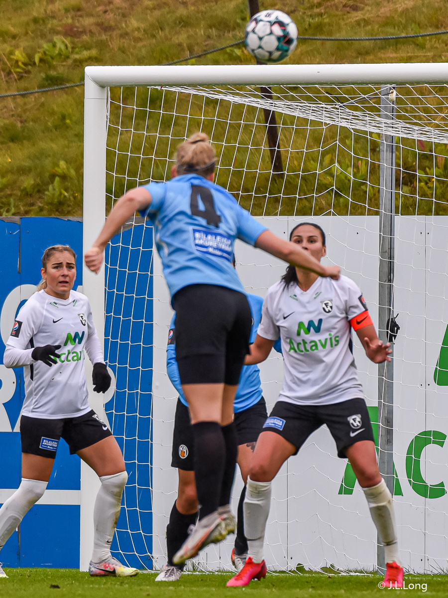 Kristín tekur spyrnuna fyrir KR, Ingunn tekur hlaup á nærsvæðið og skallar fast í áttina að Telmu í markinu sem missir af honum og inn fer boltinn. Mér finnst að Telma hefði mögulega geta gert betur þarna en kannski erfitt fyrir hana þar sem hún sér boltann seint.
