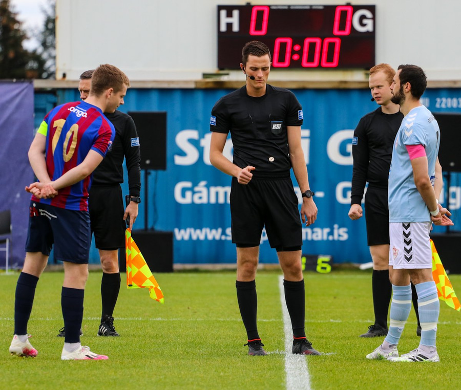 Gestirnir vilja hendi hér en Gunnar Oddur er ekki á sama máli. Verulega ósáttir á bekk gestanna.
