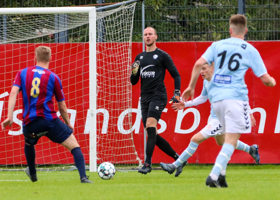 Boltinn örfáum sentimetrum frá því að fara í vinkillinn en Bergsteinn andar léttar þegar boltinn fer framhjá markinu.