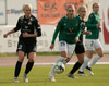 Karólína tekur skot en þetta er auðveldur æfingarbolti fyrir Hörpu í markinu.