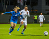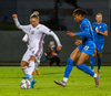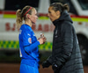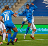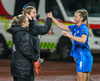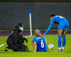 Íslensku stelpurnar vilja fá víti hér þegar Anastasija tekur Elínu Mettu niður í teignum. Dómarinn er þó ekki á því. Er búin að vera að dæma á talsvert minni hluti úti á velli