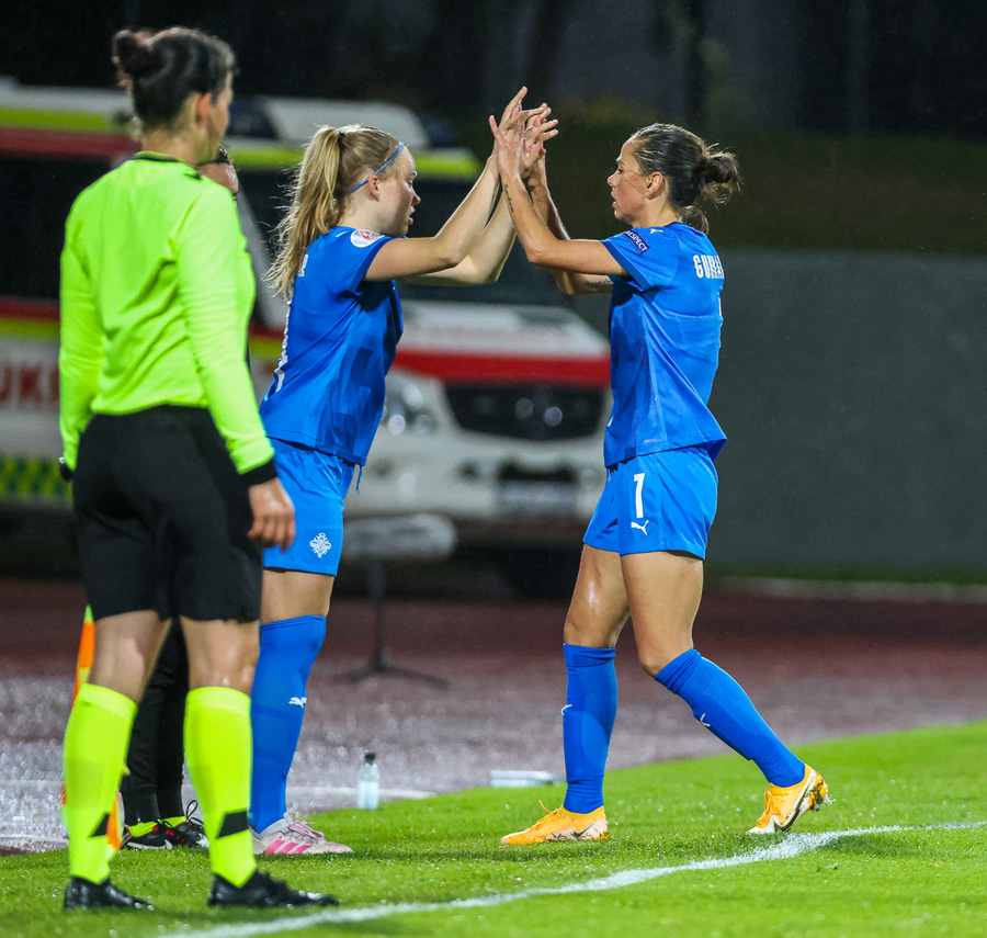 Bárbara kemur hér inn í sínum fyrsta landsleik fyrir Dagnýju sem hefur átt frábæran leik. Bárbara fer þá í hægri bak og Gunnhildur á miðjuna