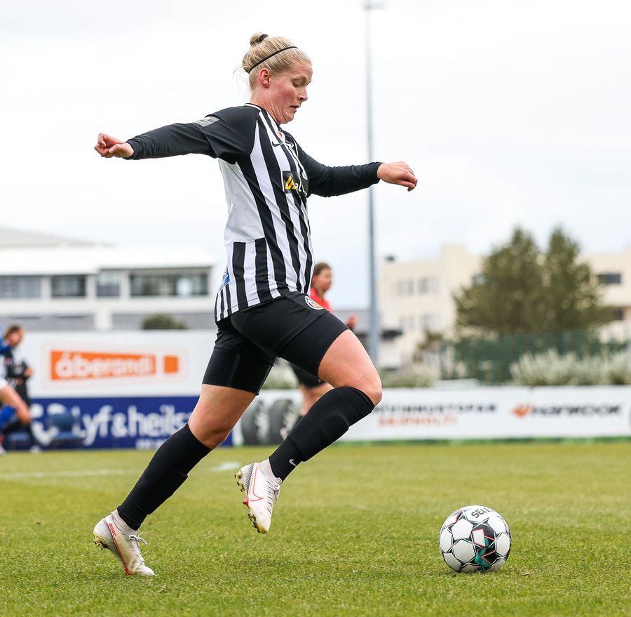 Arna Dís með takta fyrir utan teig KR. Dansar framhjá varnarmönnum KR eftir að klobba Katrínu Ómars en skotið framhjá markinu.