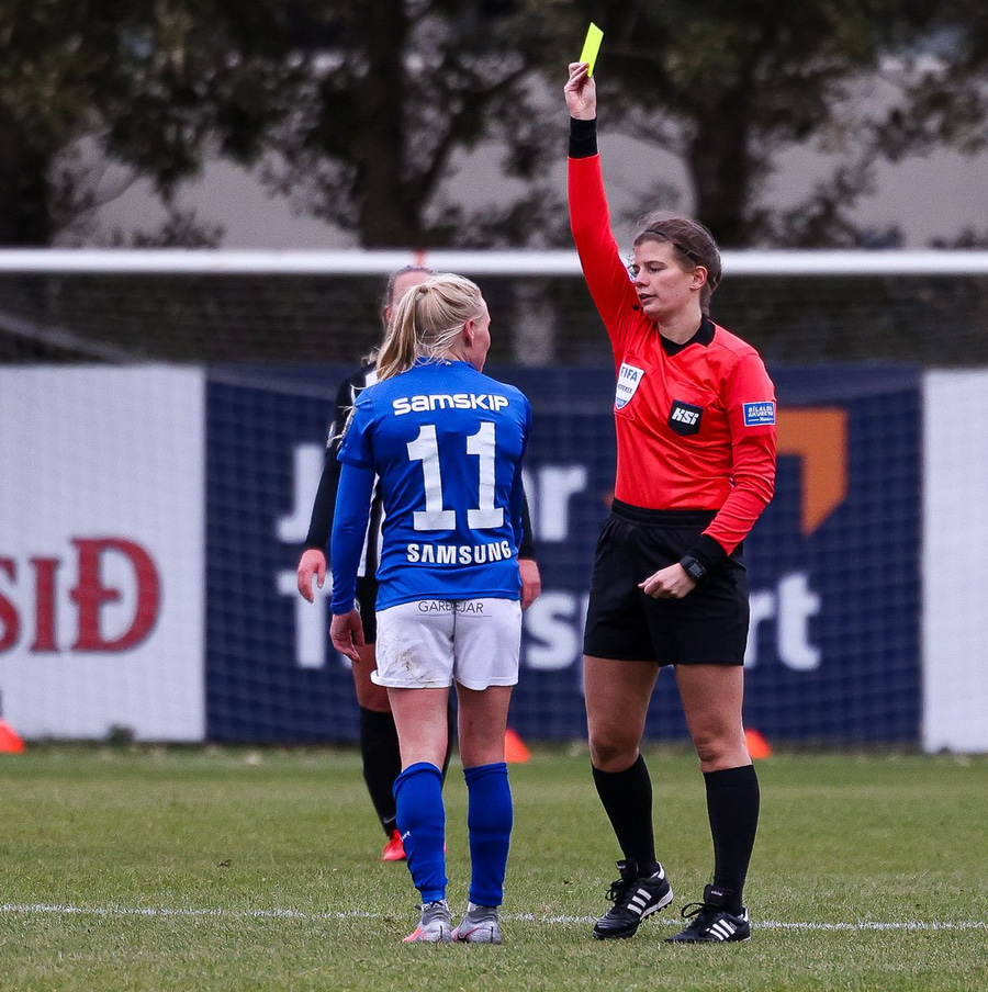 Aukaspyrna dæmd á Stjörnuna og Ingibjörg Lúcía virðist vera allt annað en sátt og lætur Bríeti vita af því. Bríet telur þessi mótmæli brotleg og gefur Ingibjörgu gult spjald.