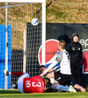 Ágúst Hlyns reynir skot fyrir utan teig sem er beint á Hannes en hann missir hann út í teiginn og þar reynir Jónatan að fylgja á eftir en hann missir hann aðeins of langt frá sér og ekkert verður úr þessu