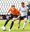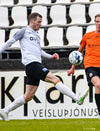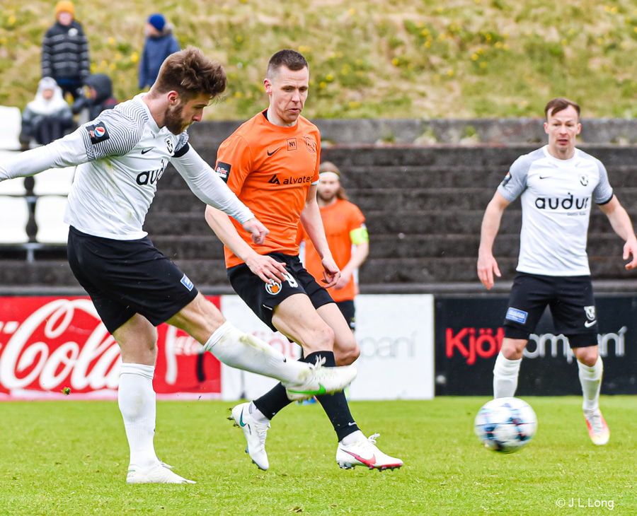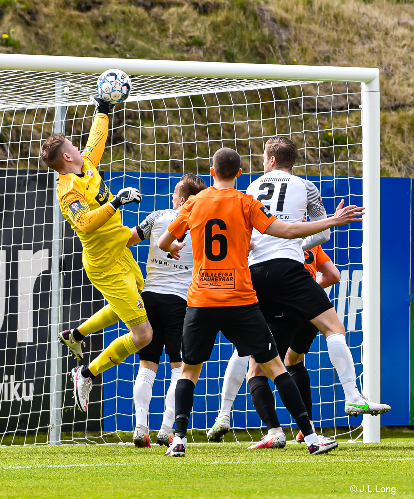 Atli Sigurjóns reynir skot af löngu færi sem Gummi Kri "bjargar á línu".