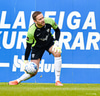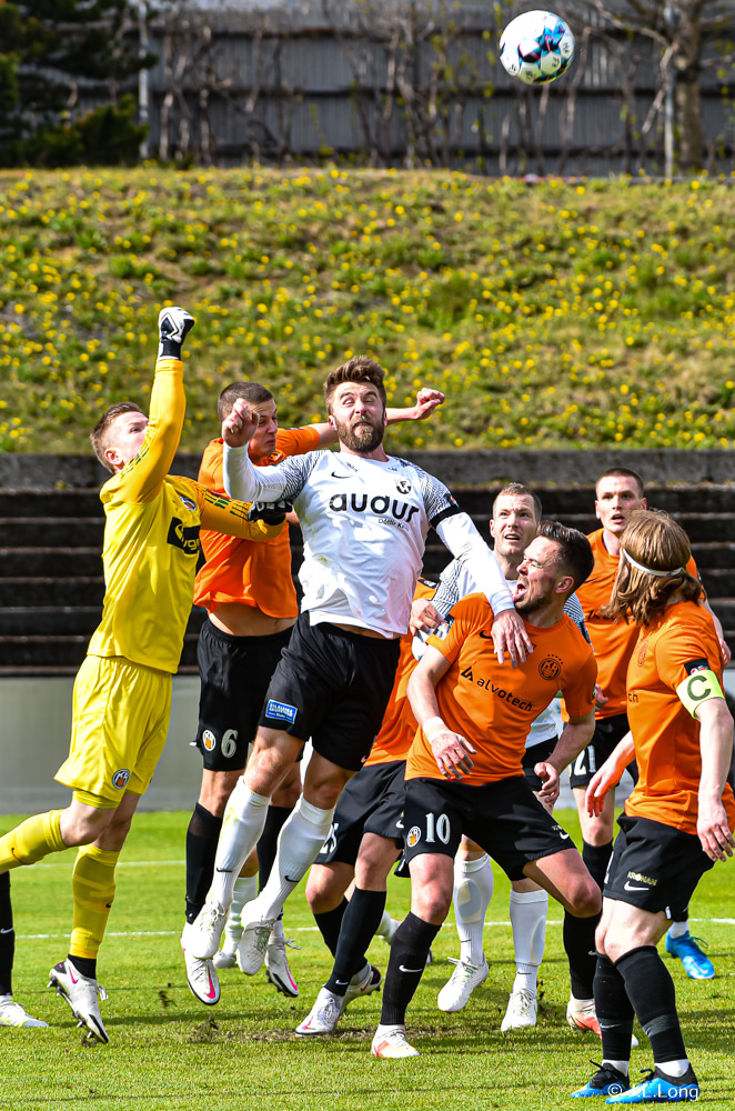 Beitir þarf að hafa sig allan við að halda þessum úr markinu! Boltinn dettur í slánna og Beitir nær að bjarga því að hann detti innfyrir línuna.
