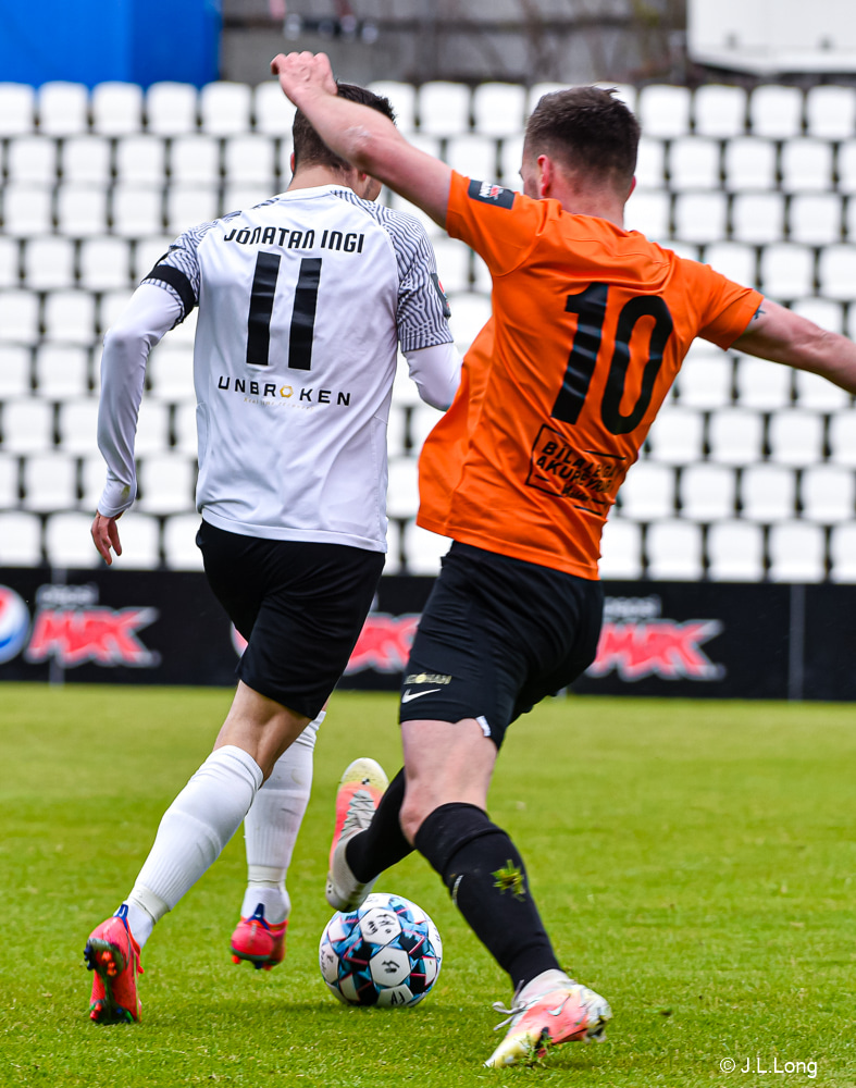 Jónatan Ingi tekur hornið á nærstöng þar sem Björn Daníel kemur á ferðinni en skallinn yfir markið.