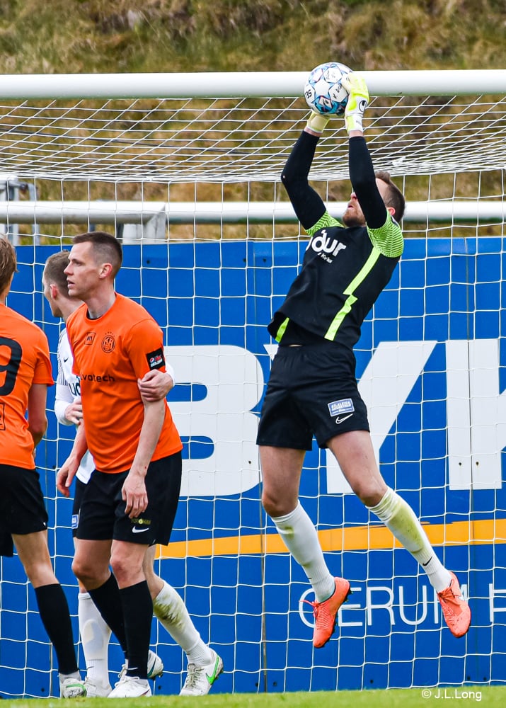 Arnþór Ingi reynir skot af löngu færi þegar KR eru komnir 3 á 1 og sér að Gunnar er framarlega en Gunnar ekki í vandræðum með það.