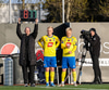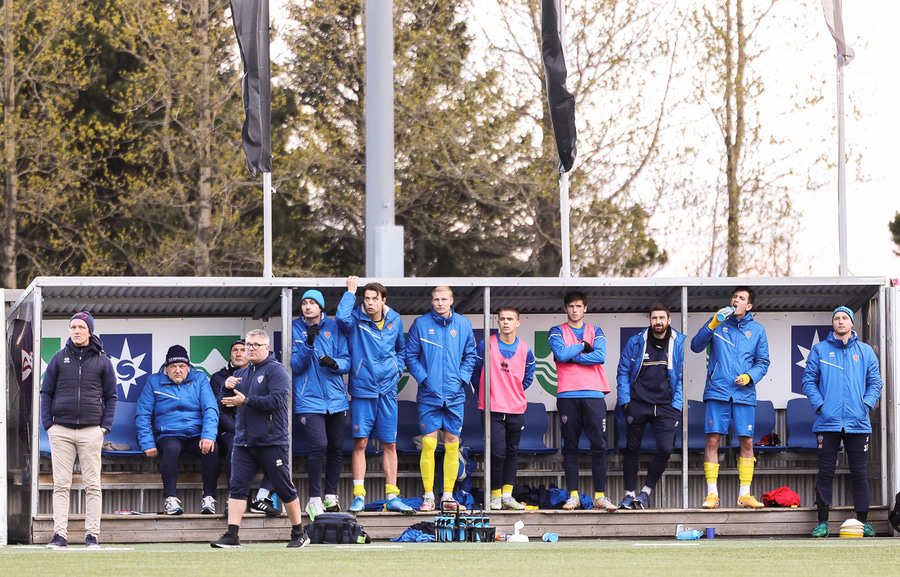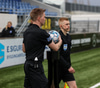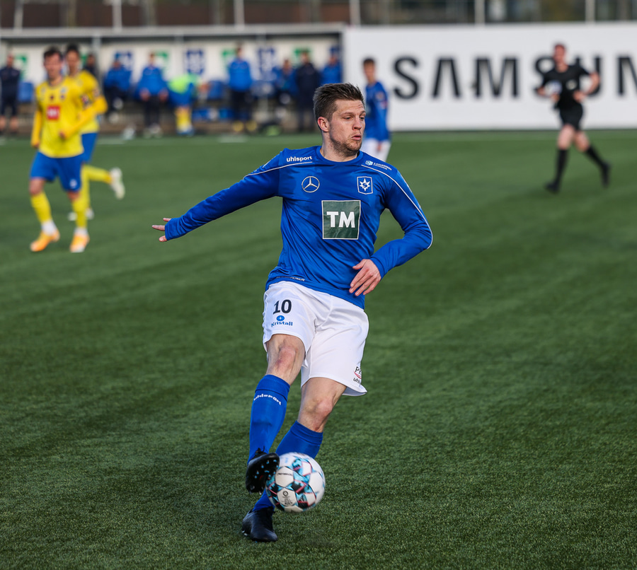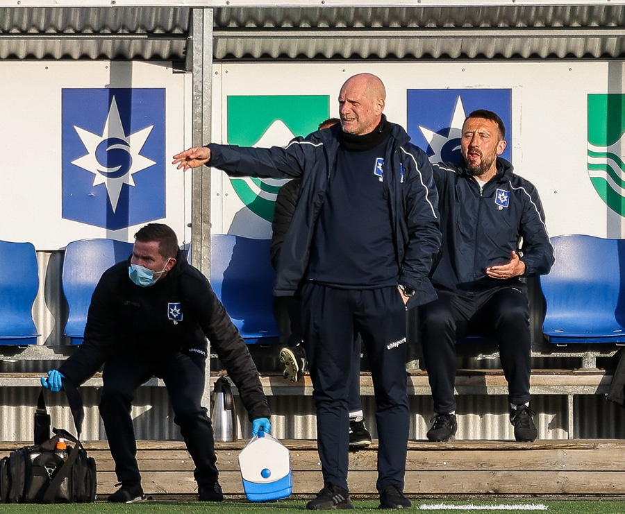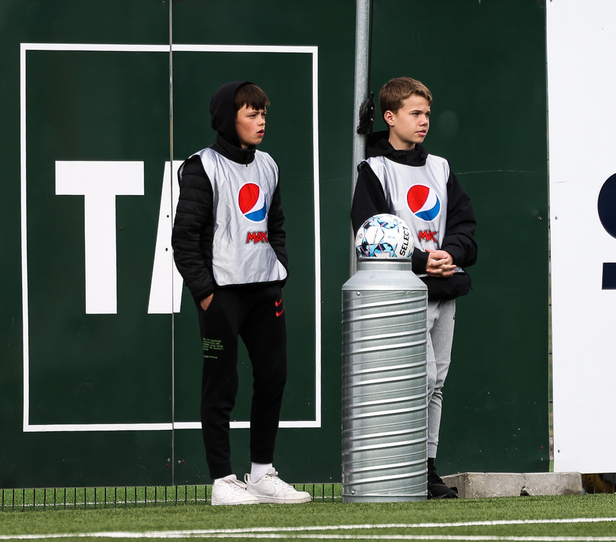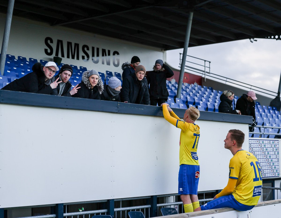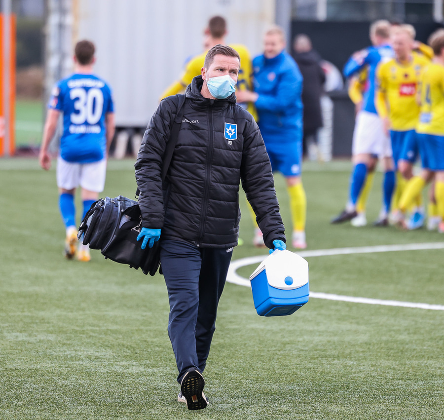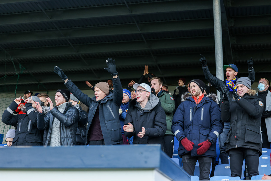 Leikurinn er hafinn og heimamenn byrja með boltann. Minnt er á grímuskylduna í hátalarakerfinu, sem er vel þótt það sé fámennt í stúkunni.