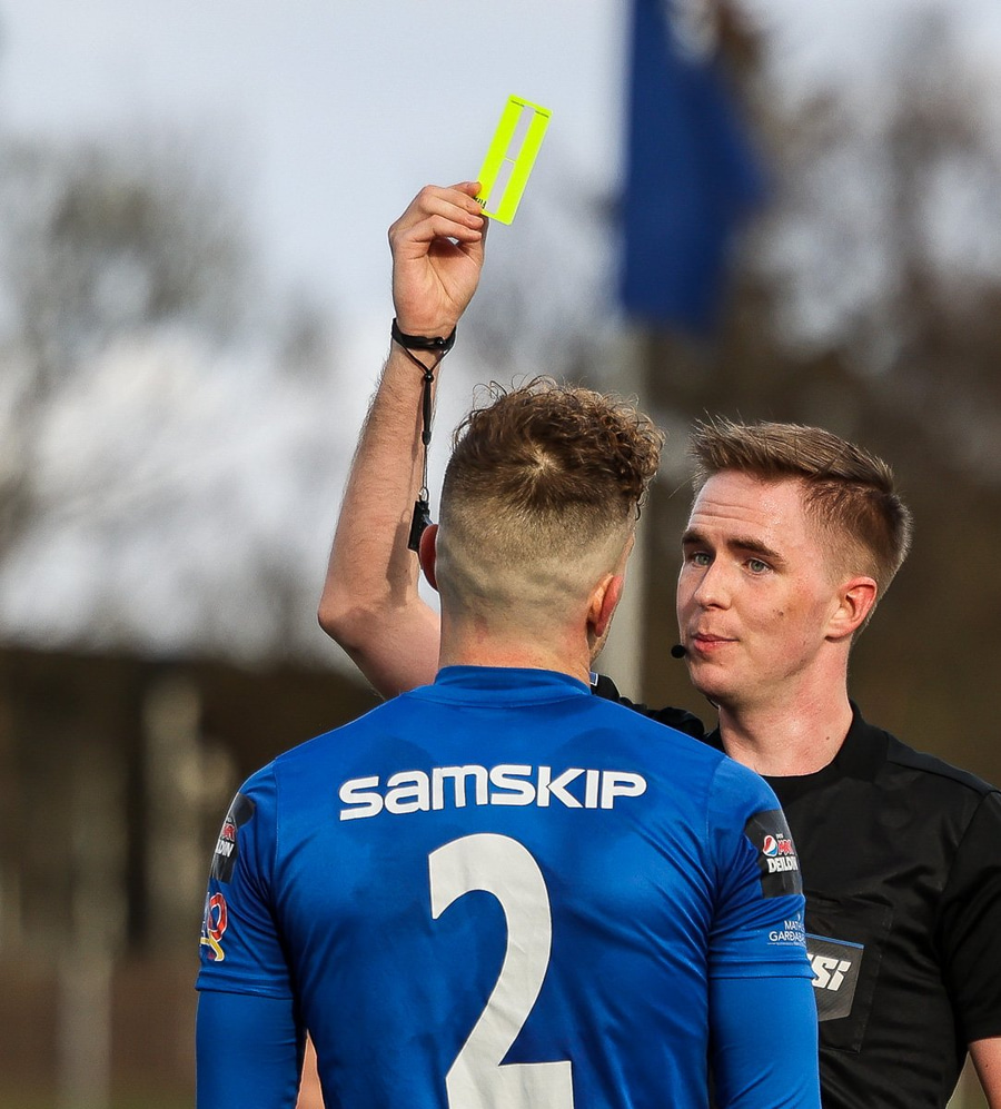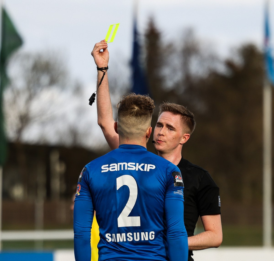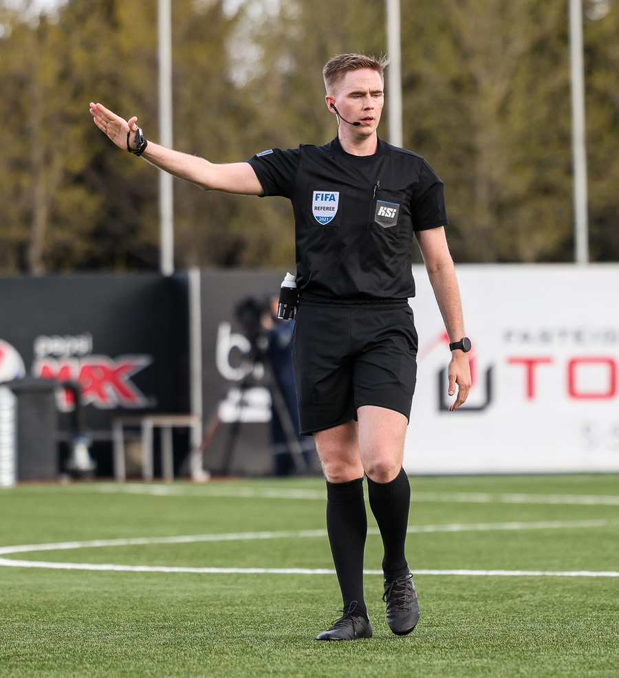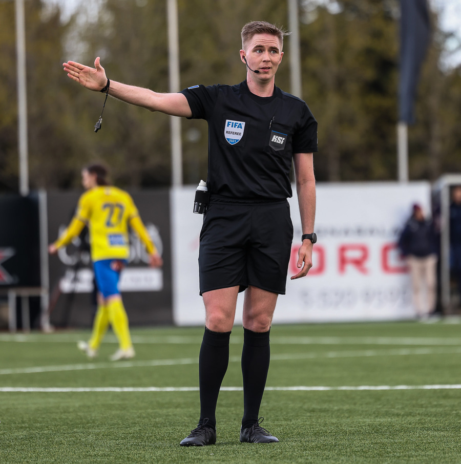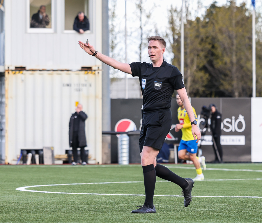 Helgi Mikael Jónasson er sá sem heldur utan um flautuna í kvöld. Honum til aðstoðar eru þeir Þórður Arnar Árnason og Smári Stefánsson.